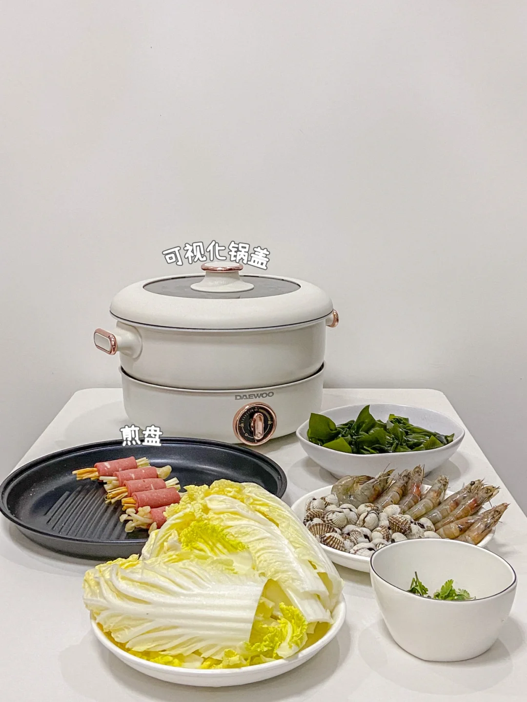 🍲收到锅子的时候真的惊呆了 居然这么大 5L的容量太适合聚餐涮火锅了 和家人们diy火锅大餐 6.7个人吃完全够够滴 三档旋转调节火力控制 敲方便 多功能料理锅可以蒸 煮还可以煎 吃火锅前还可以煎个培根金针菇 牛排 烤肉也适合😇