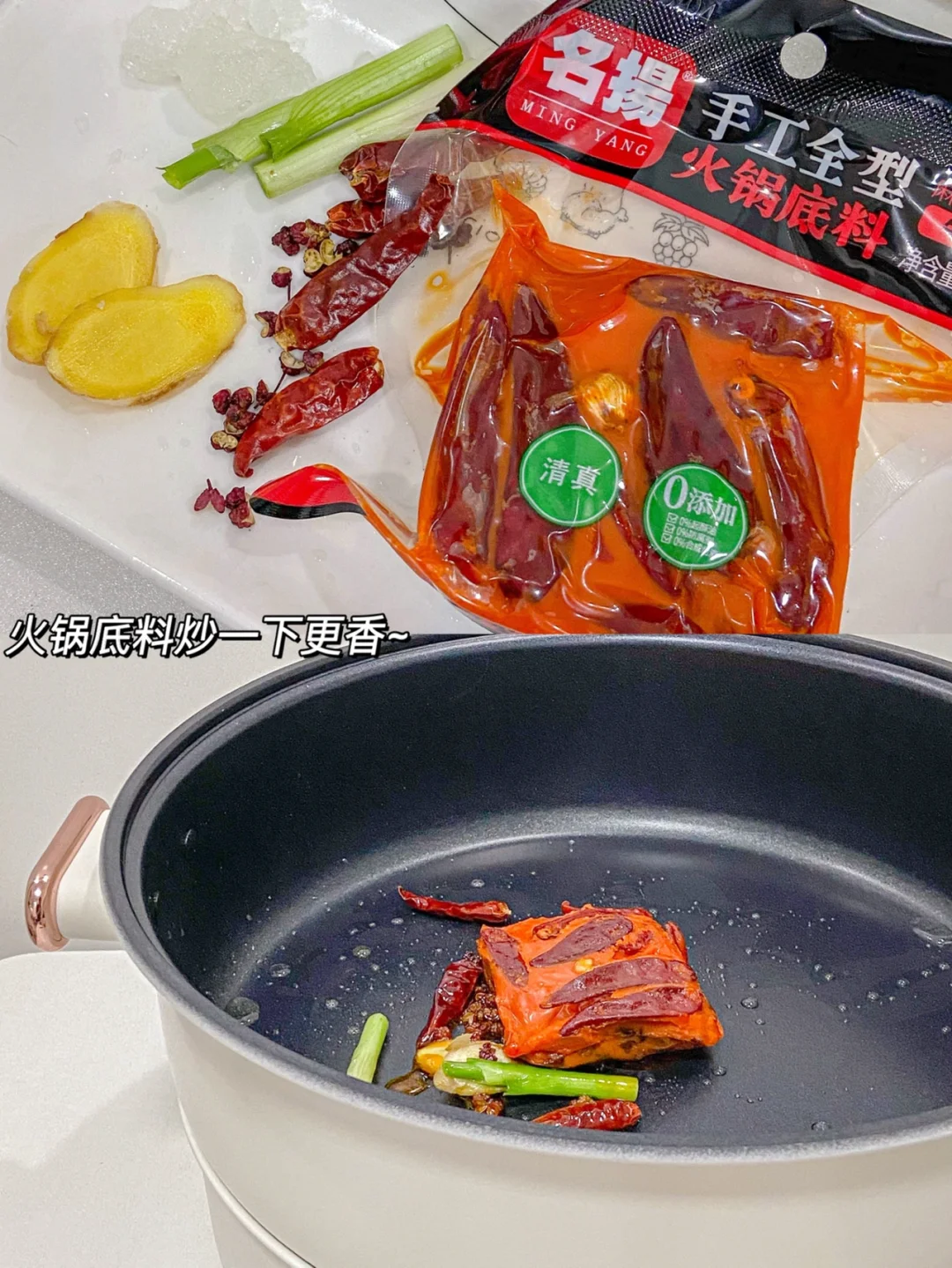 油➕葱段姜片➕花椒➕辣椒炒香➕火锅底料➕开水➕一小勺盐味精➕冰糖