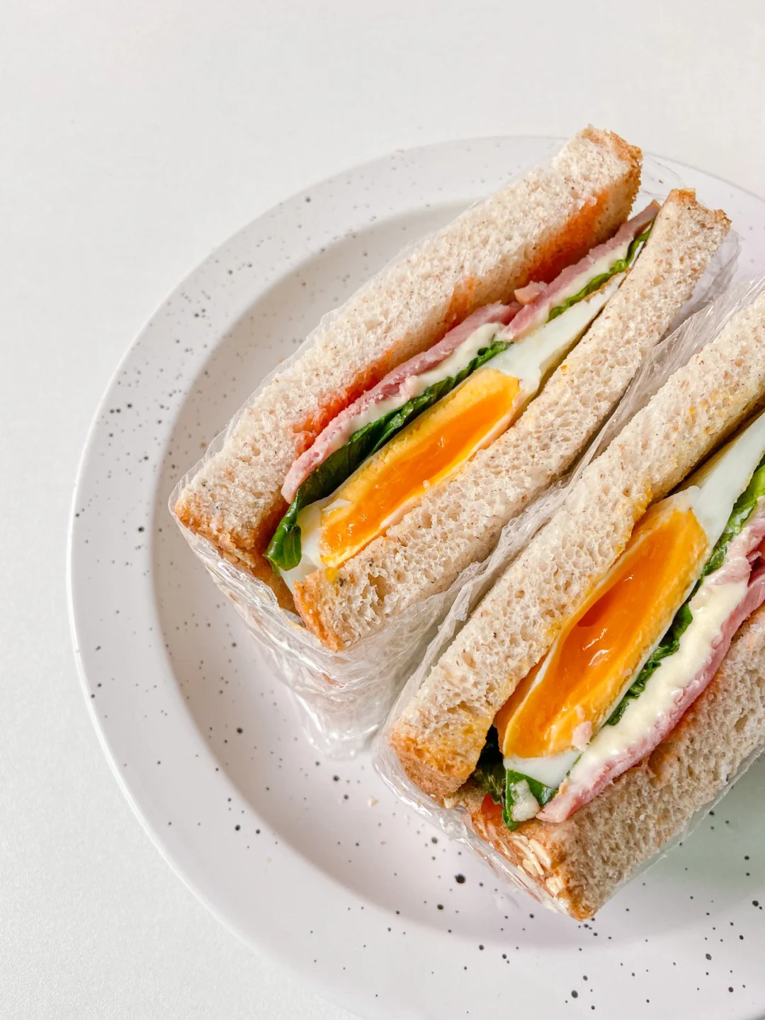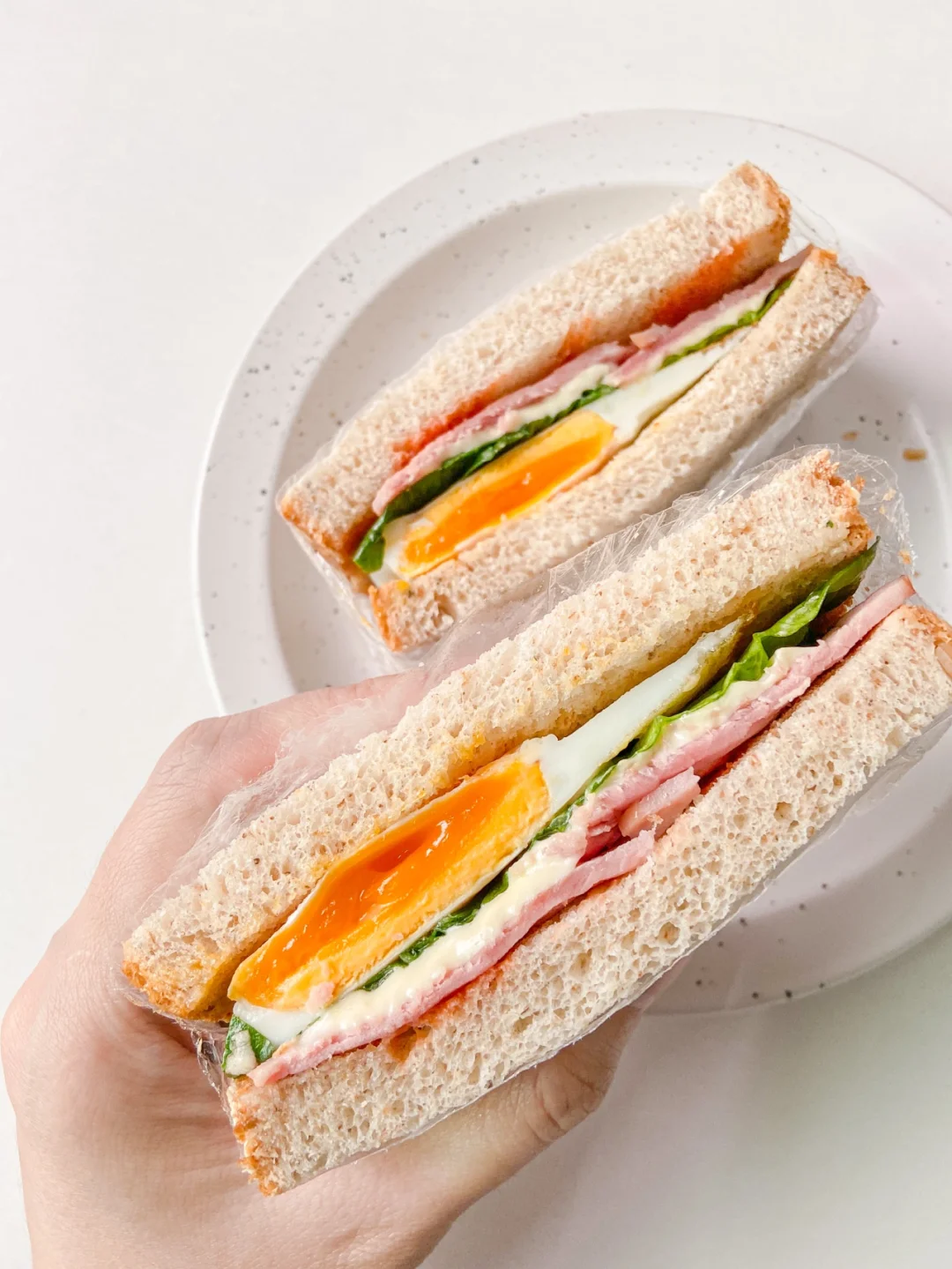 3️⃣再放上一片吐司 按压一下 保鲜膜包一下 切一半即可