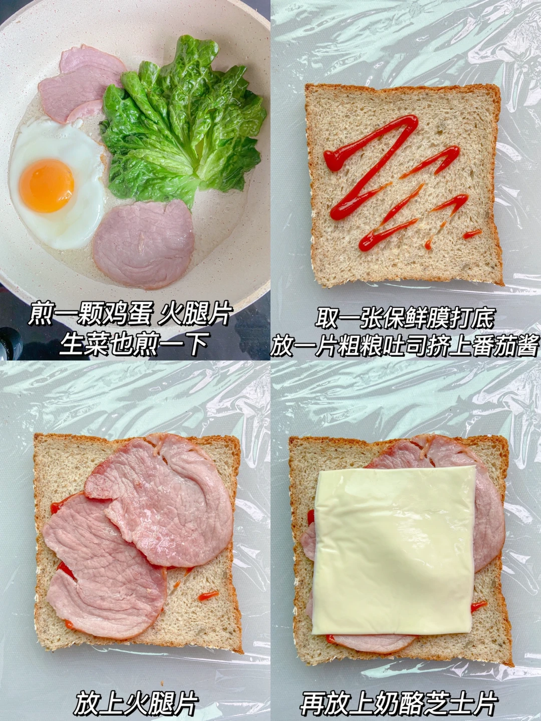 2️⃣取一张保鲜膜打底 一片粗粮吐司挤上番茄酱陆续放上配菜和芝士片