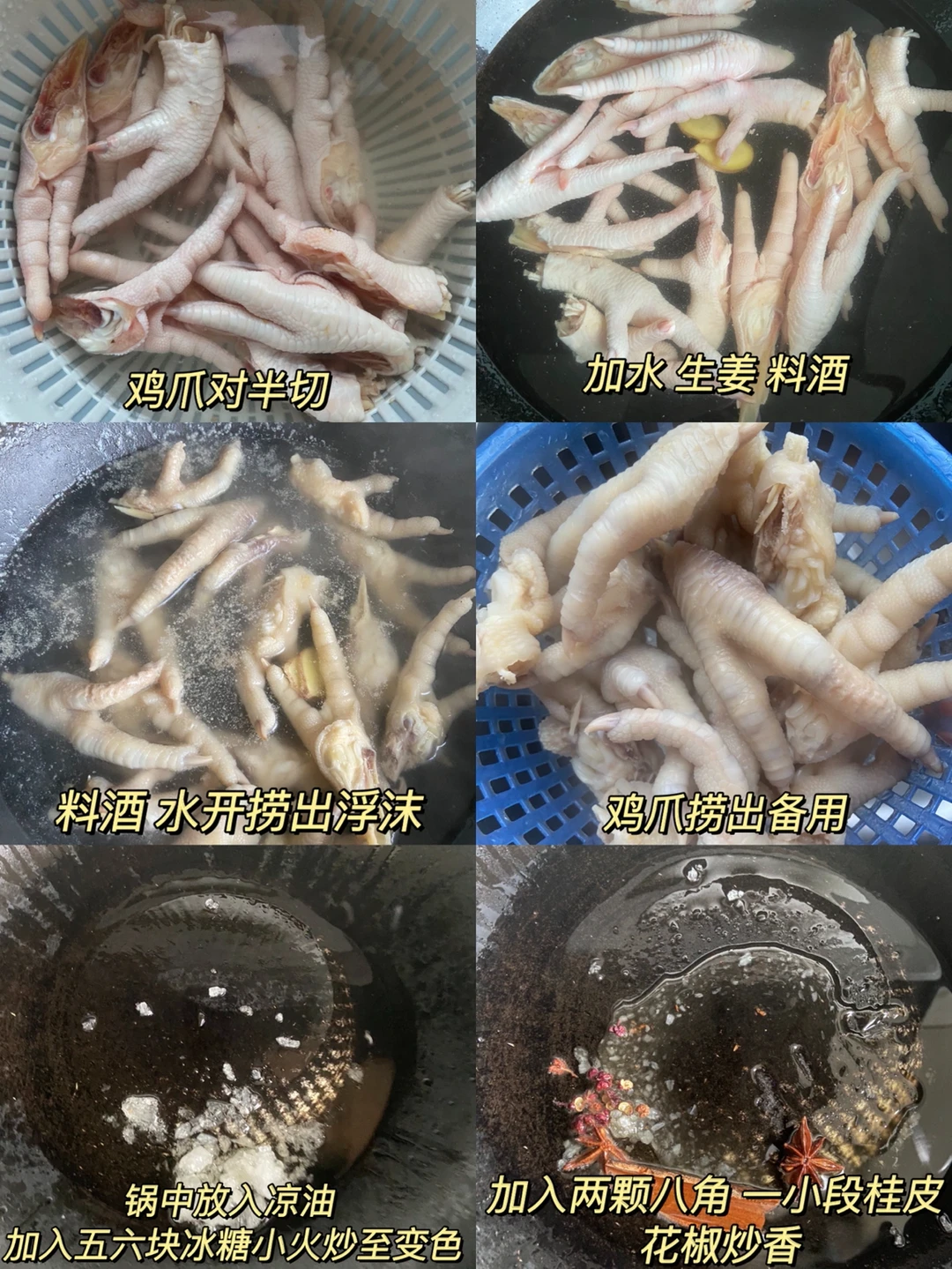 1️⃣鸡爪对半切 ➕生姜 料酒 水开捞出浮沫 鸡爪捞出备用