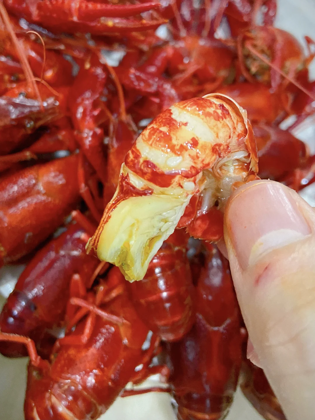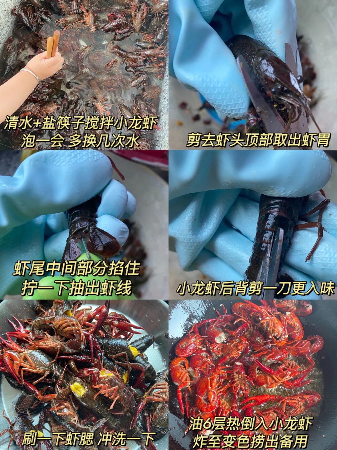 1️⃣ 处理虾:剪去虾头顶部取出虾胃 虾尾中间部分掐住拧一下抽出虾线 小龙虾后背剪一刀更加入味 刷一下虾腮 冲洗一下就很干净了