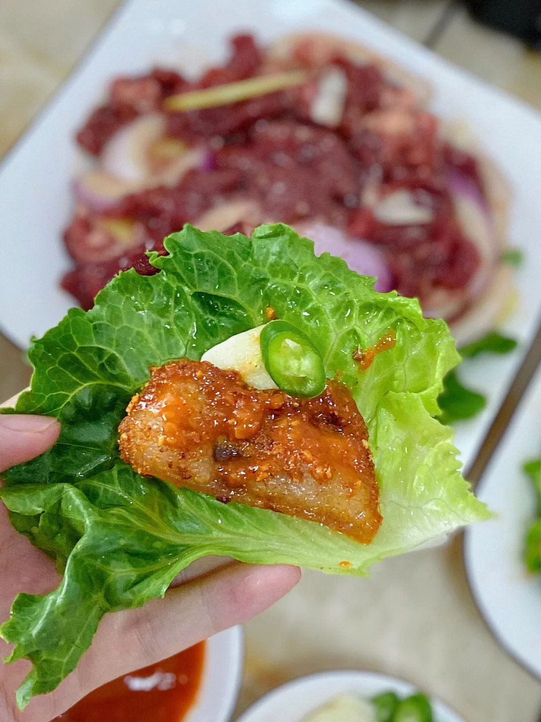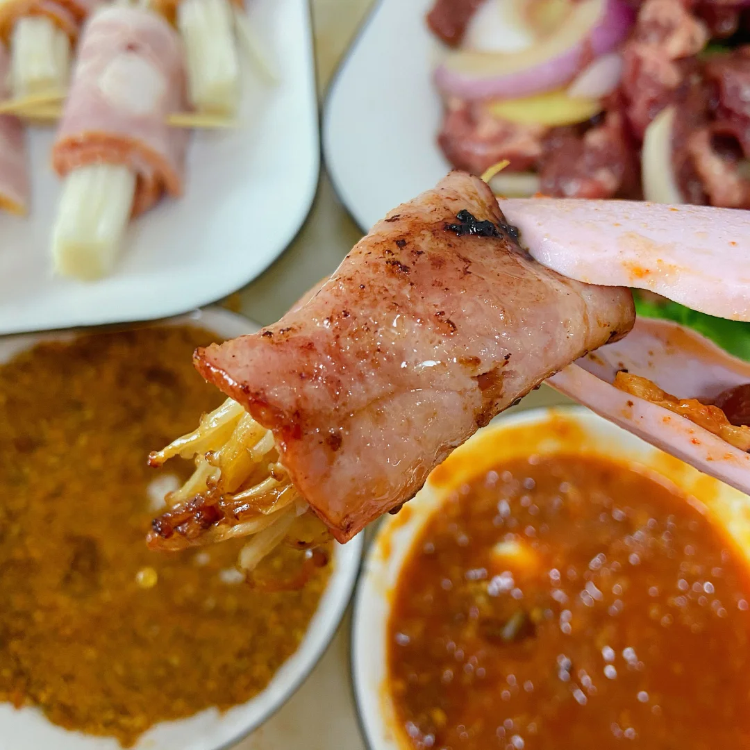 烤完的肉蘸酱料包+蒜片+线椒包生菜绝绝子 自己做又便宜又好吃 赶快试试吧!😘