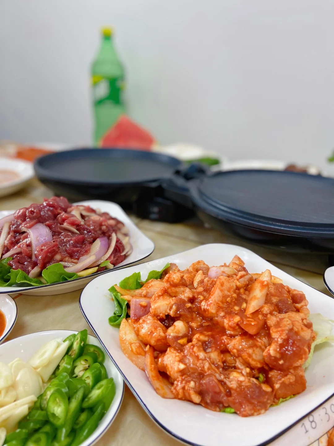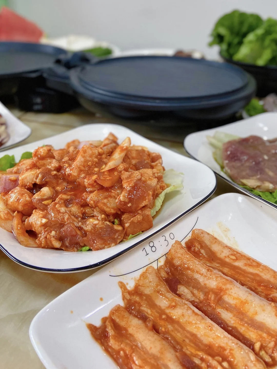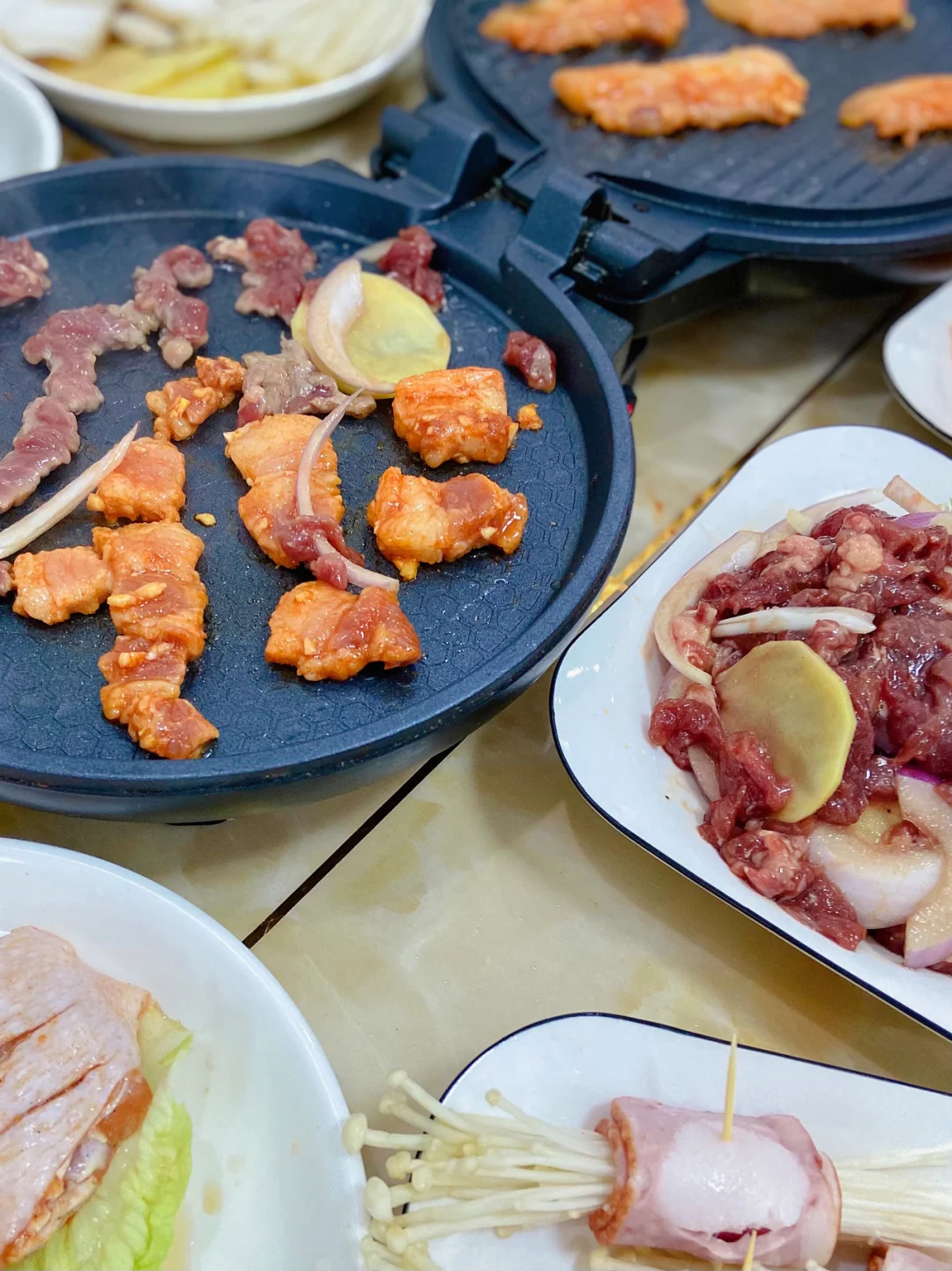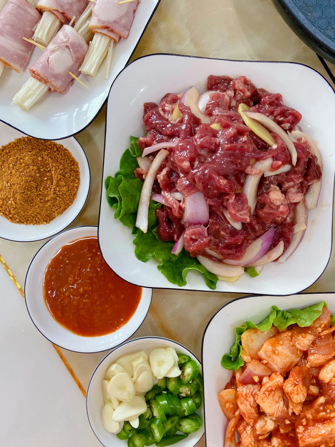 准备食材:牛肉 牛排 五花肉 鸡中翅 韭菜 金针菇 培根 杏鲍菇 土豆 生菜 洋葱