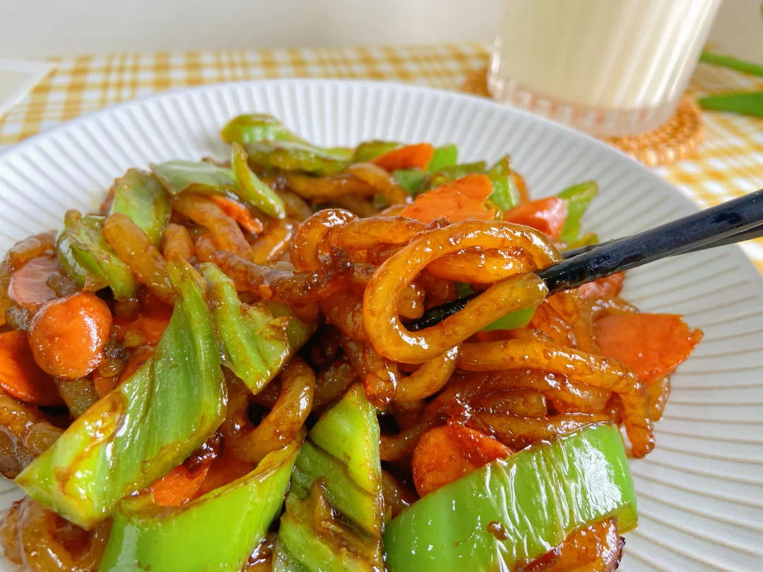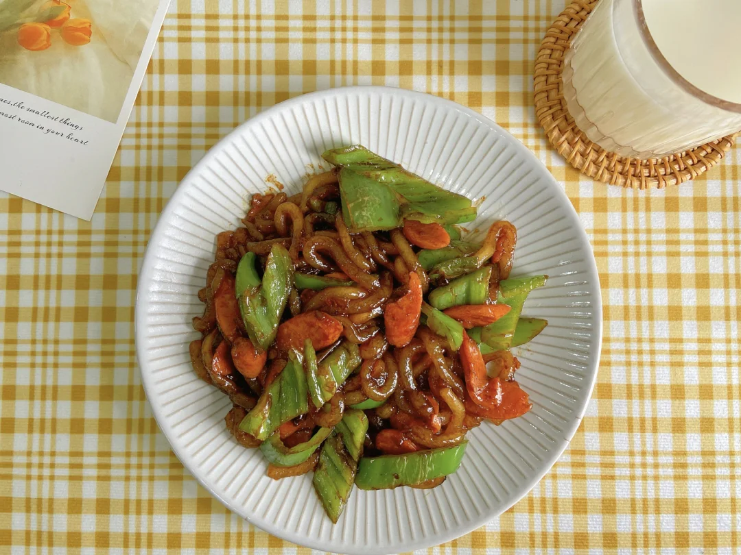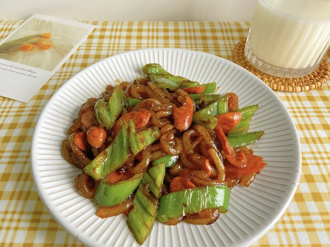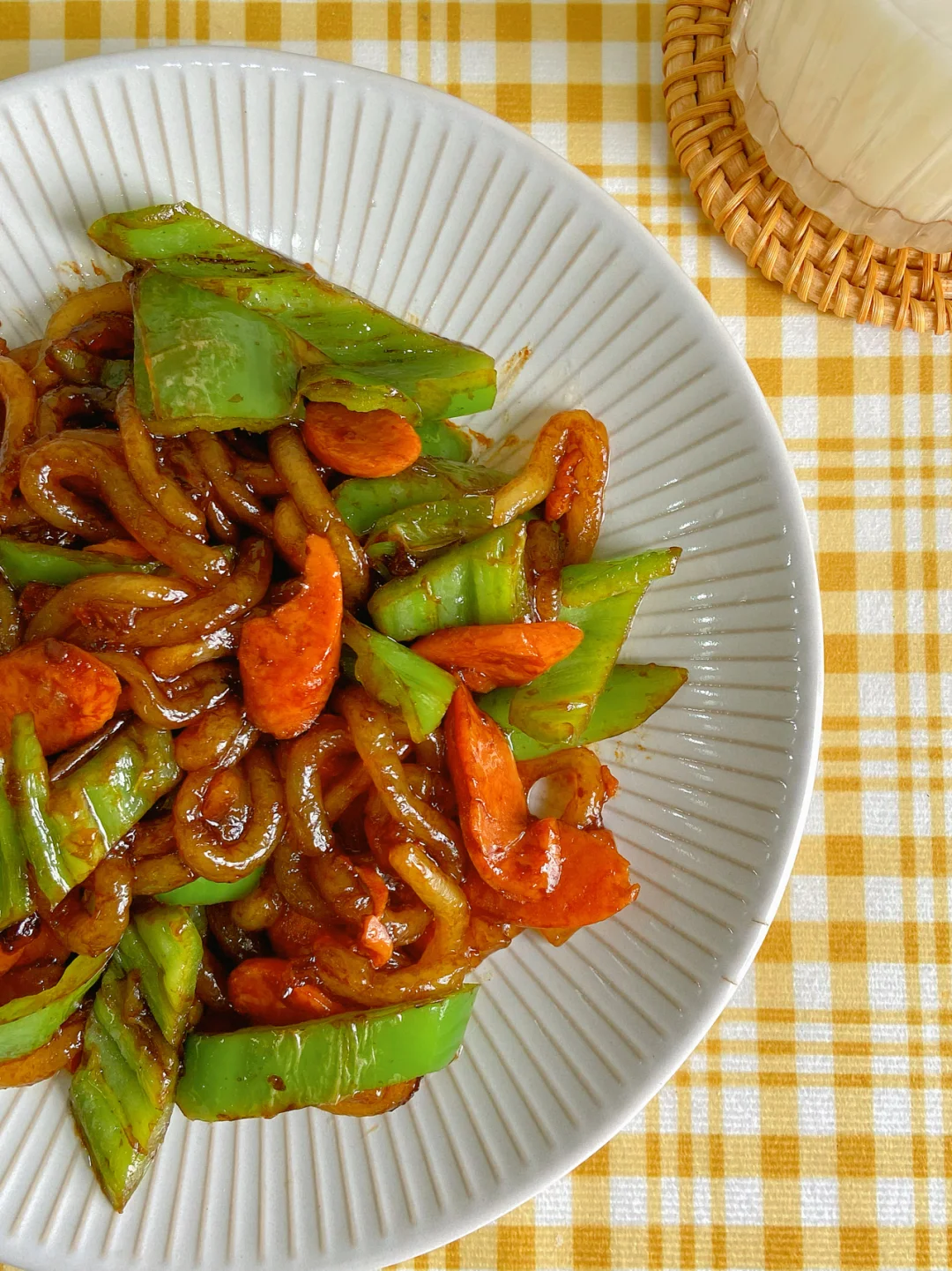 3️⃣热油放入青椒火腿肠翻炒片刻 放入乌冬面翻炒 加入一勺生抽 一勺蚝油 半勺老抽 半勺盐 最后撒上适量胡椒粉翻炒均匀即可