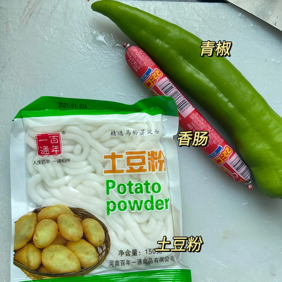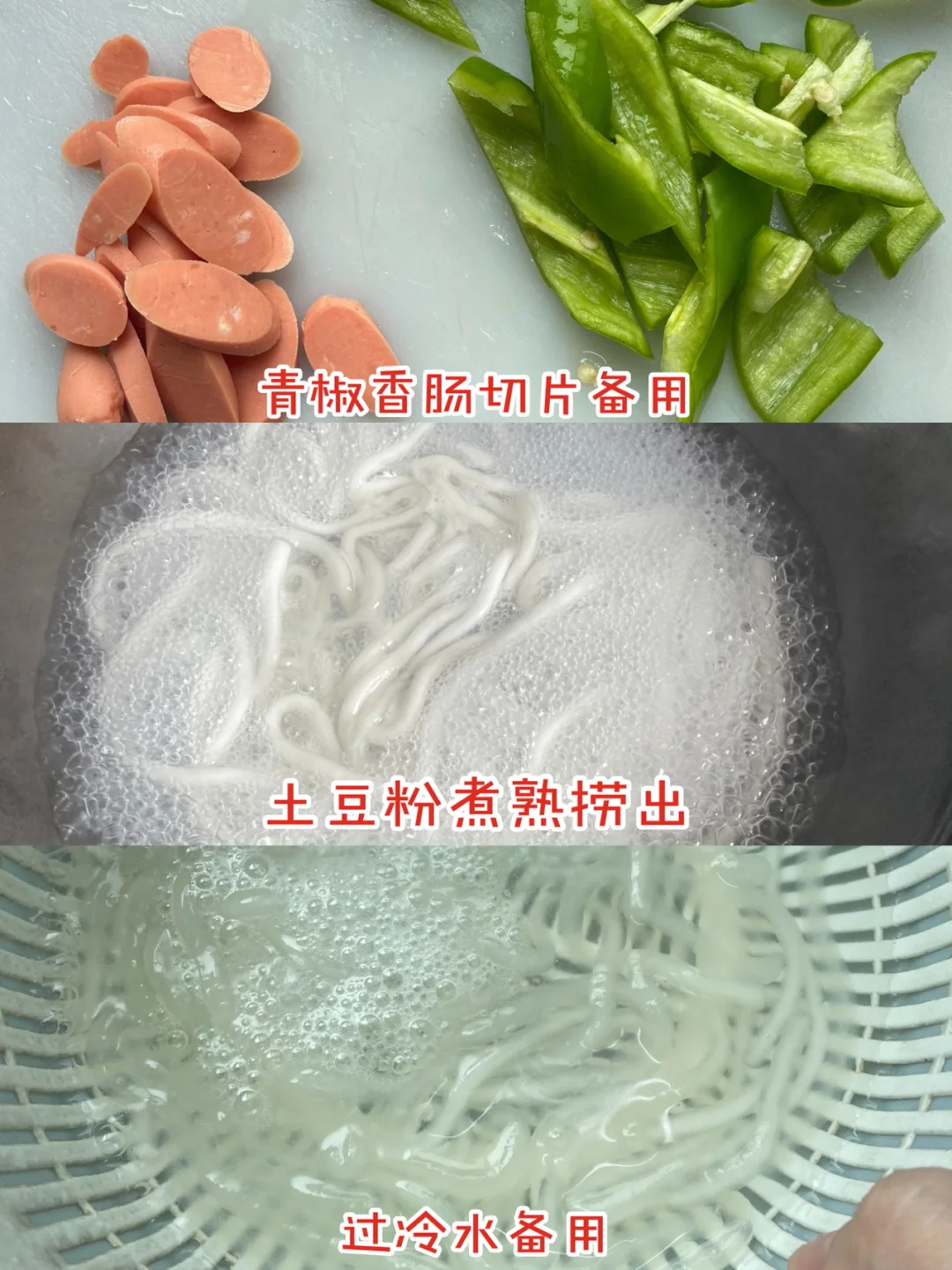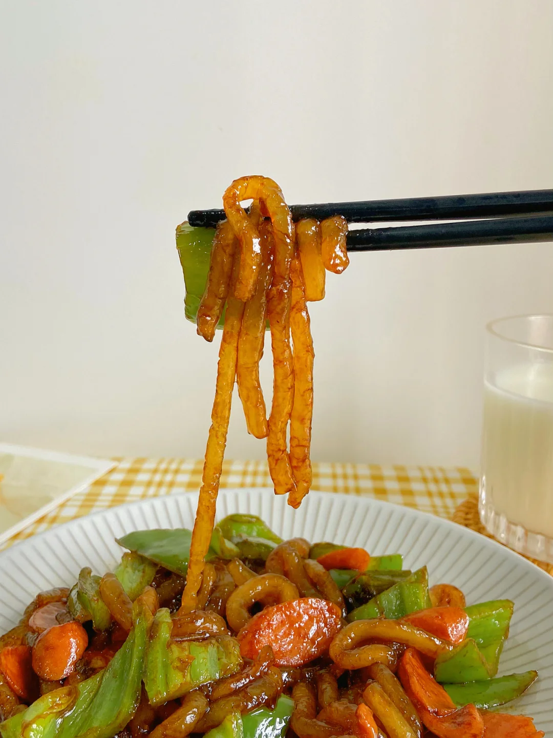 3️⃣热油放入青椒火腿肠翻炒片刻 放入乌冬面翻炒 加入一勺生抽 一勺蚝油 半勺老抽 半勺盐 最后撒上适量胡椒粉翻炒均匀即可