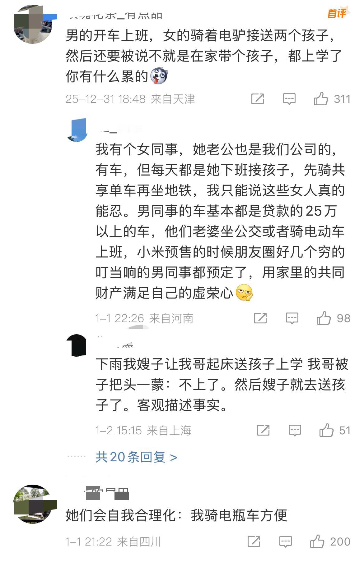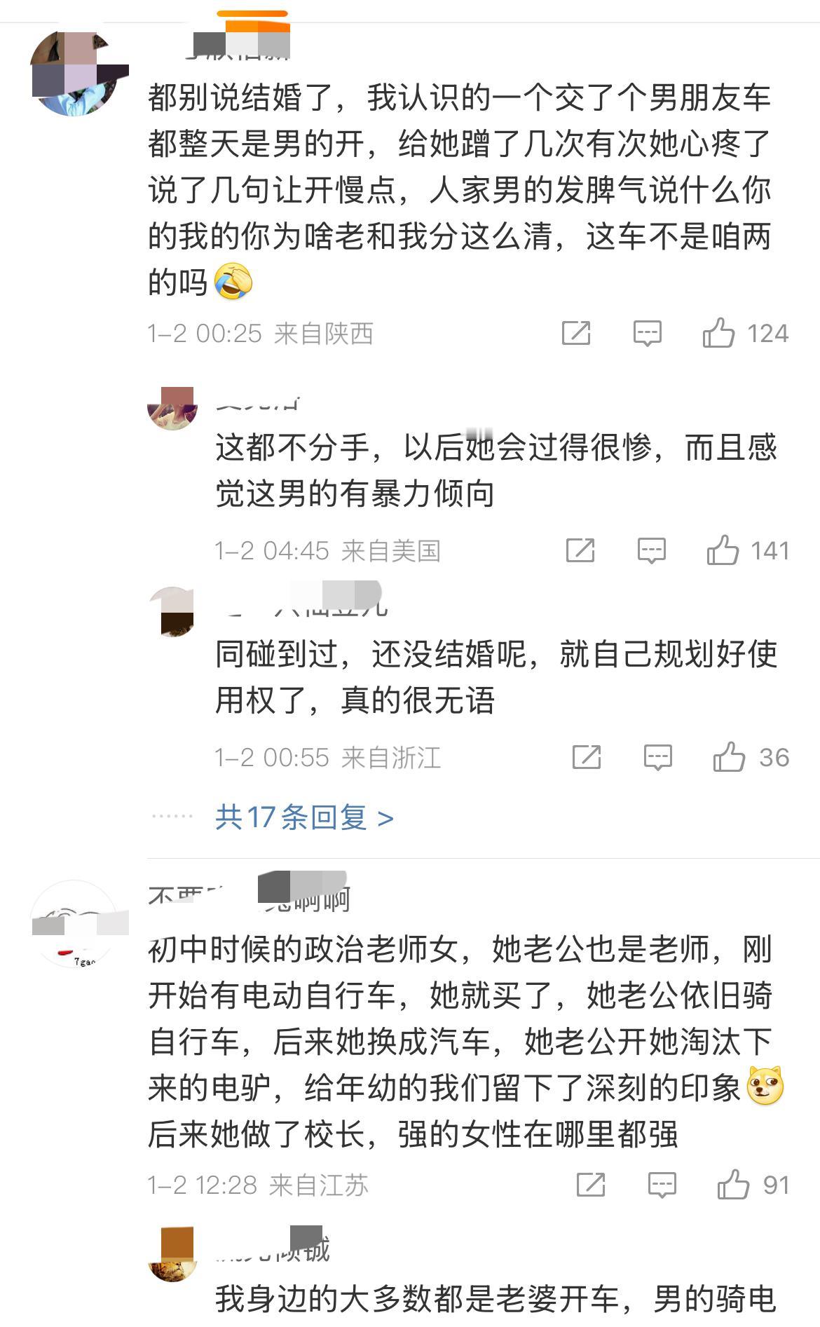 难道结婚了就默认车是男方开,女的只配骑电驴吗?不管是谁买的车?我同事婚前自己买了车,婚后给她老公开了,她自己骑电动车上班,有一年冬天她流产了,因为每天骑车上班吹冷风落下了病根,婚女果然都是忍者啊。纯纯的委屈自己,只为了长男人的面子,笨死了!感觉很多女生就是恋爱脑晚期,完全不会为自己考虑的[允悲]!而且就这样还要催婚催生二胎[吃瓜群众],这样的女人只为自己的千秋万代活着,完全是害怕自己的完美的基因血脉消失,催生的几乎都是女人【奶奶或母亲大人】,想不通……女生开什么车