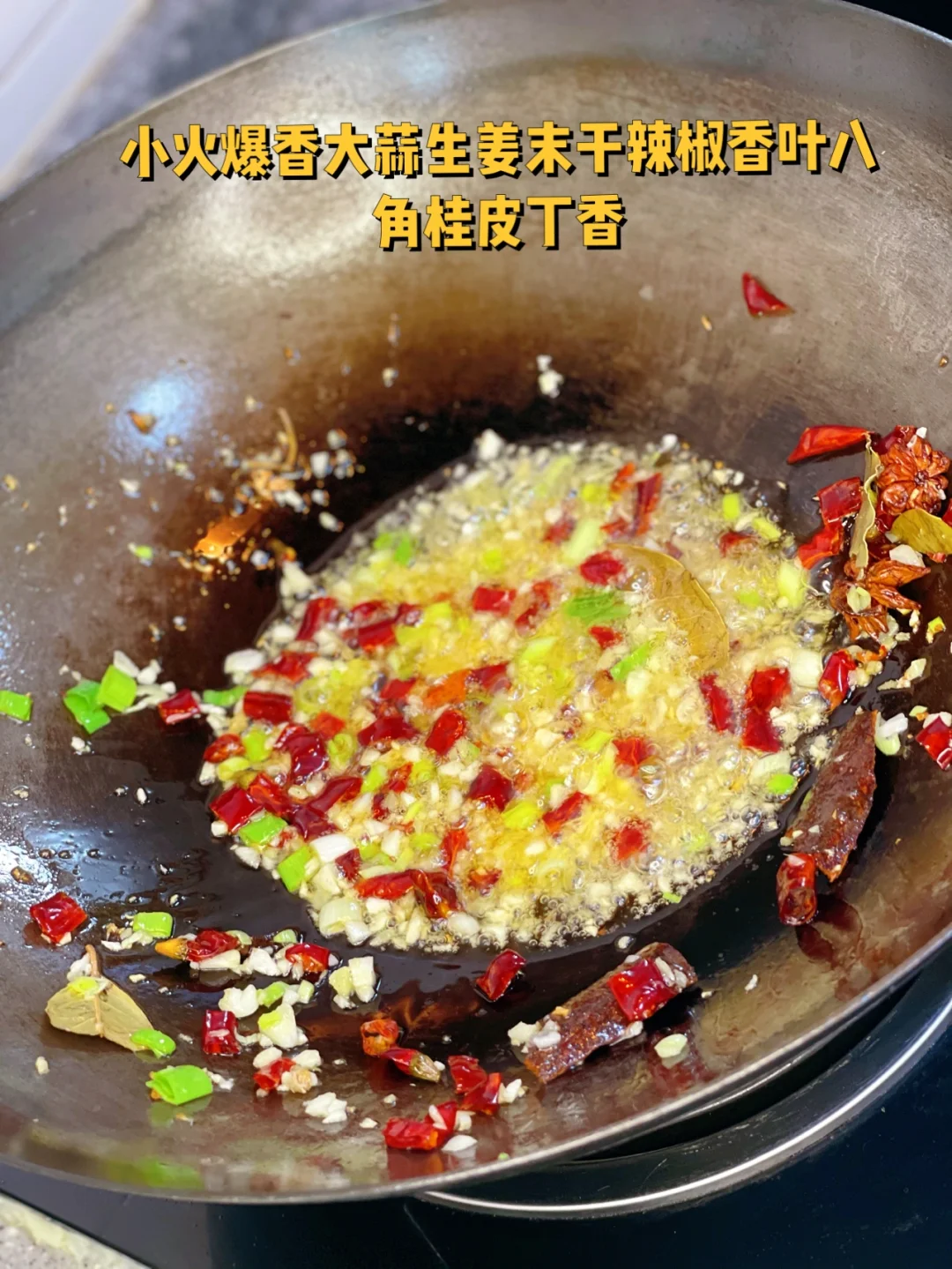 8. 小火爆香大蒜生姜末干辣椒香叶八角桂皮丁香