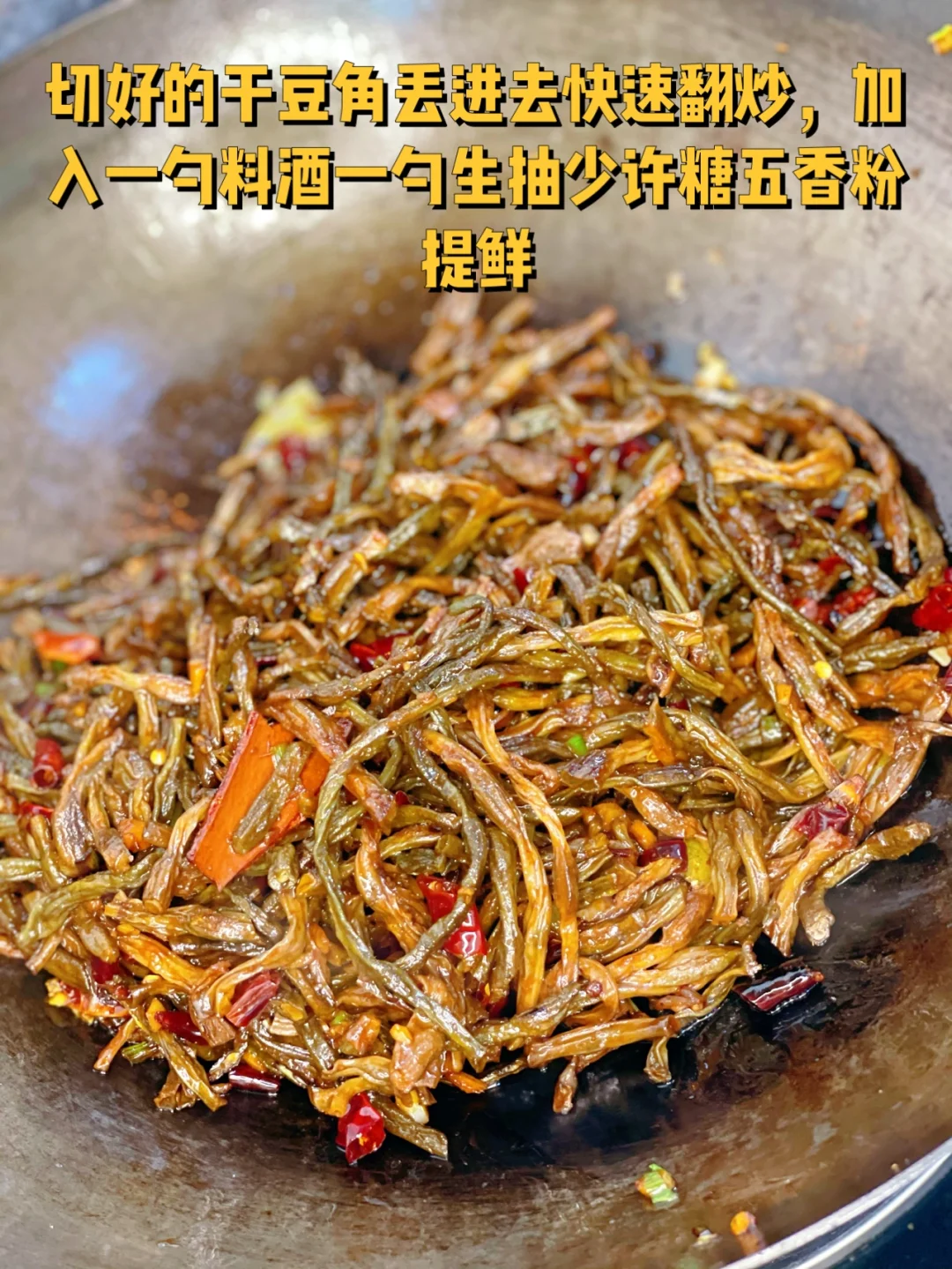 9. 切好的干豆角丢进去快速翻炒,加入一勺料酒一勺生抽少许糖五香粉提鲜