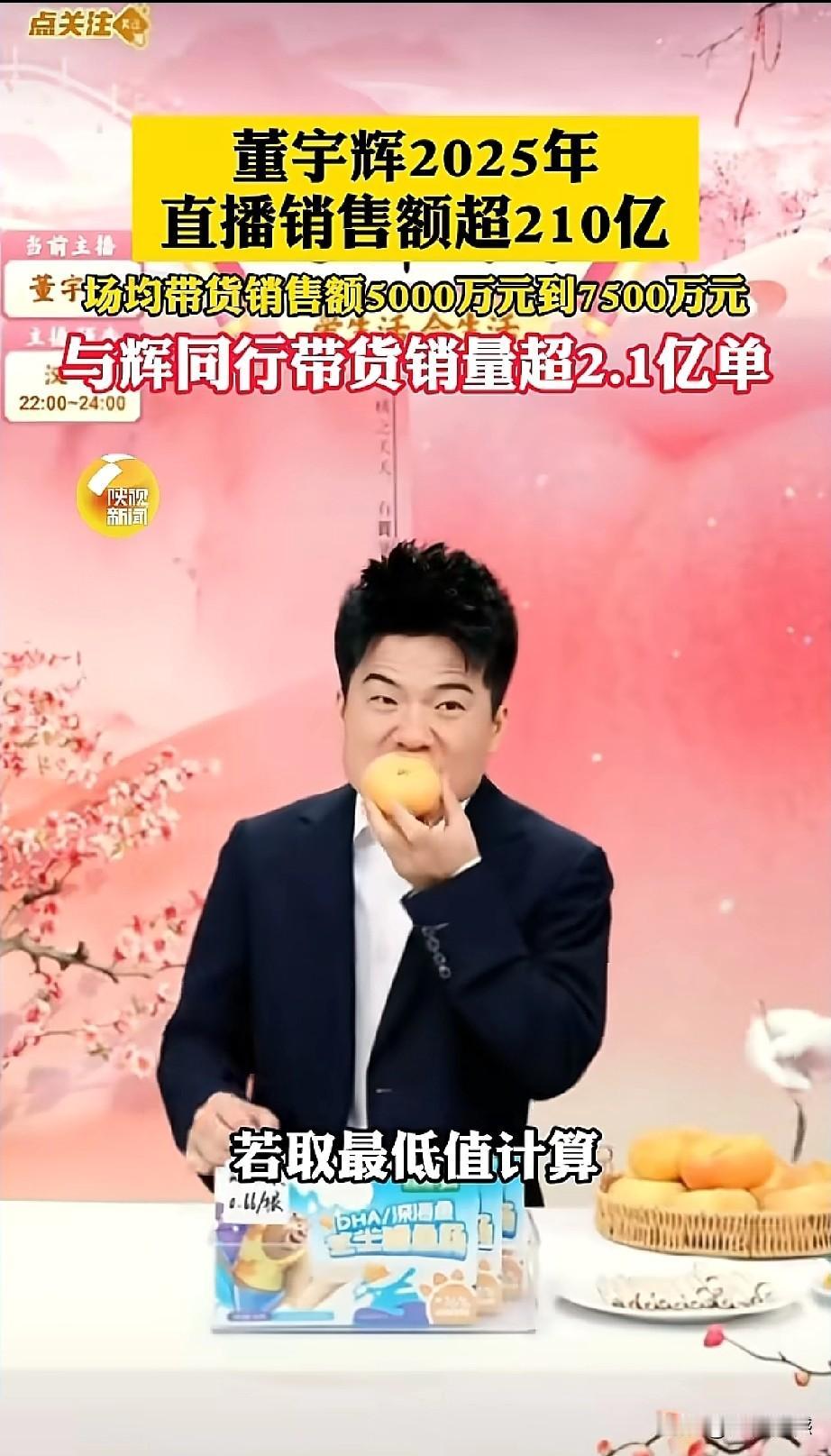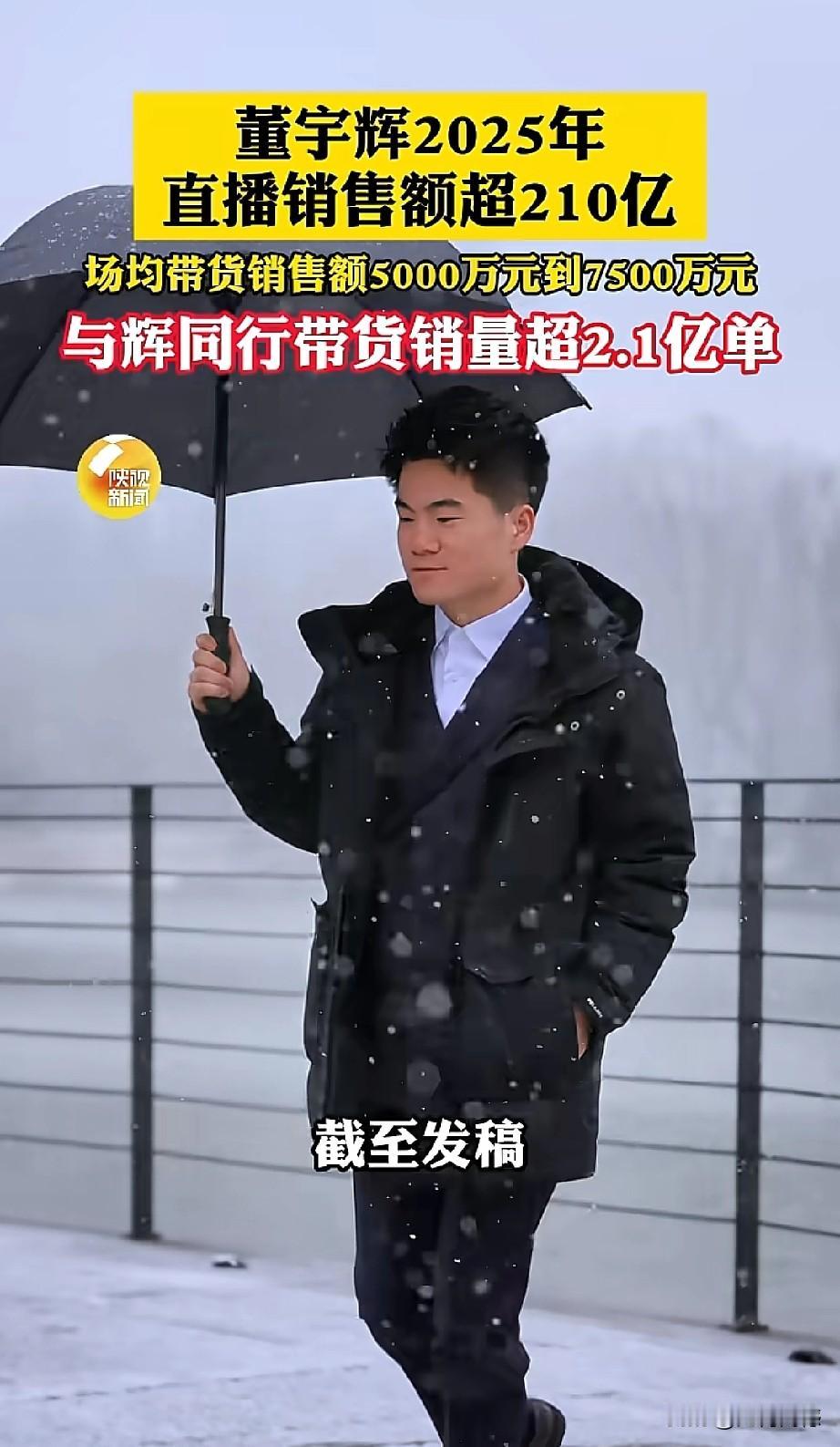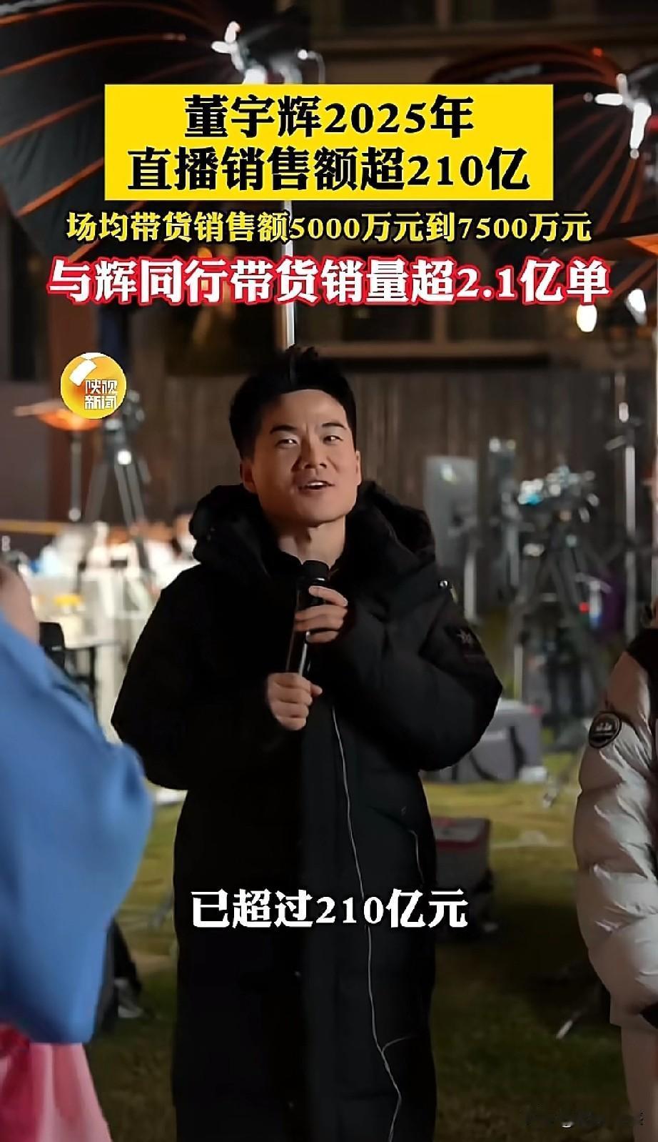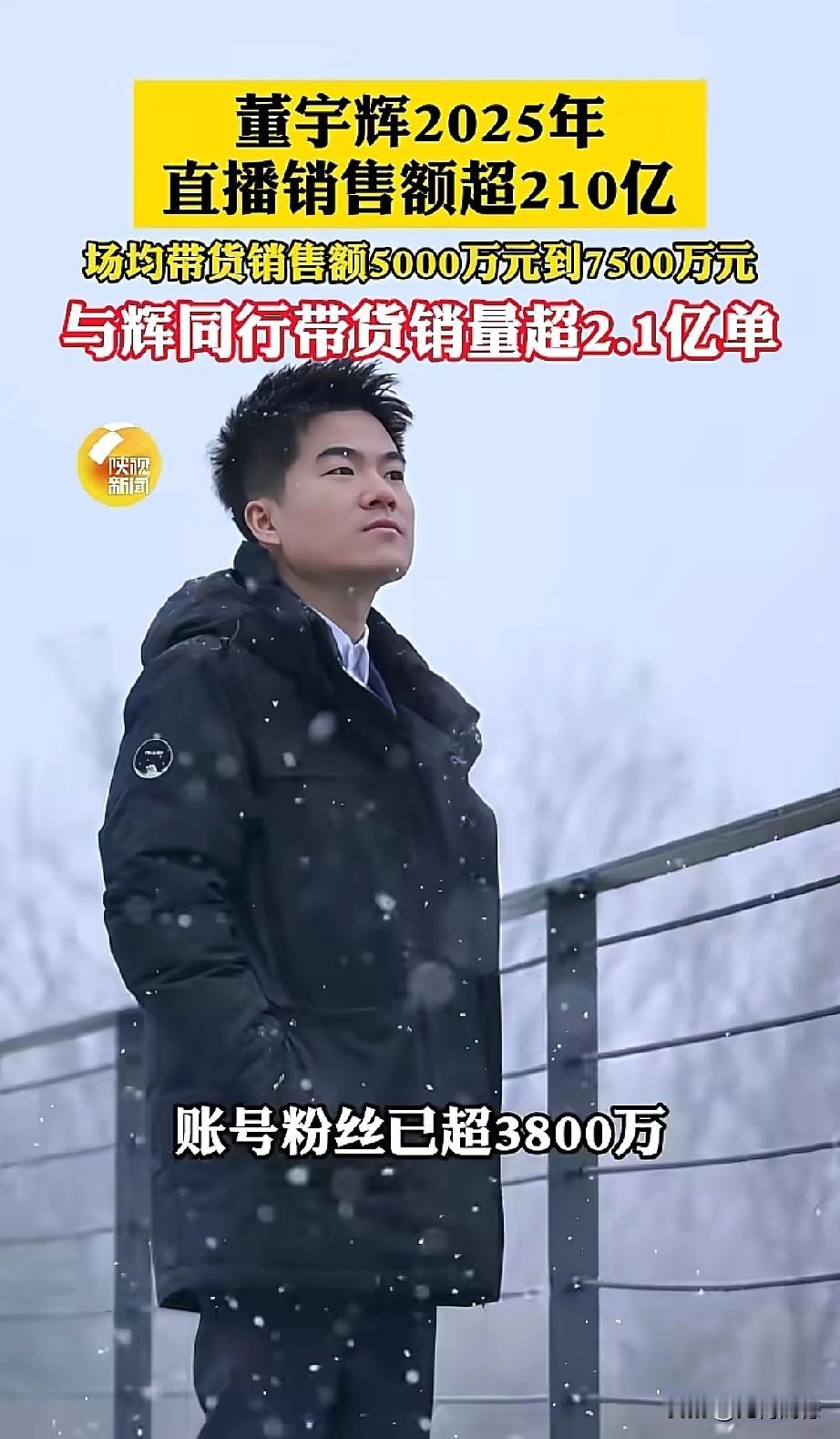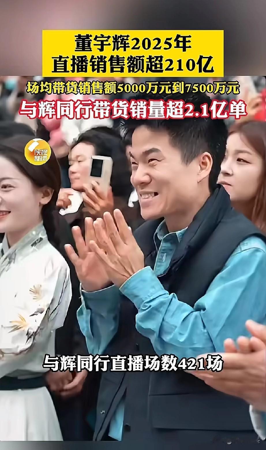 董宇辉2025年直播带货销售额超过210亿元!董宇辉真是一个直播带货奇才,2025年又创造了直播带货佳绩,全年直播421场,平均每场直播带货销售额达到5000万元到7500万元,账号粉丝也超过了3800万。这个人真是太厉害了,不知道在带货方面,还有没有比他更厉害的?