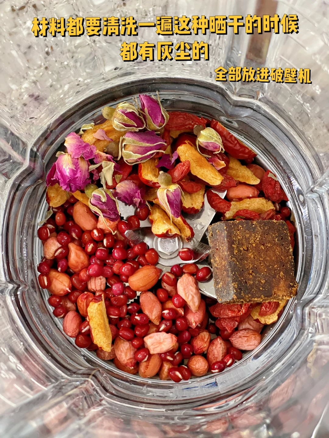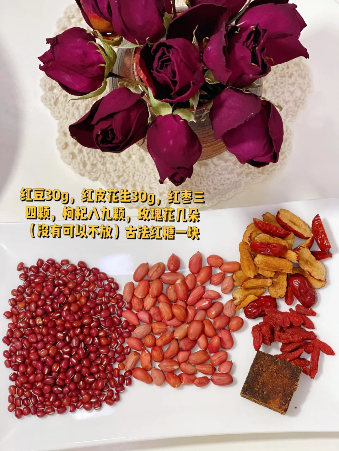 1. 红豆30g,红皮花生30g,红枣三四颗,枸杞八九颗,玫瑰花几朵(没有可以不放)古法红糖一块