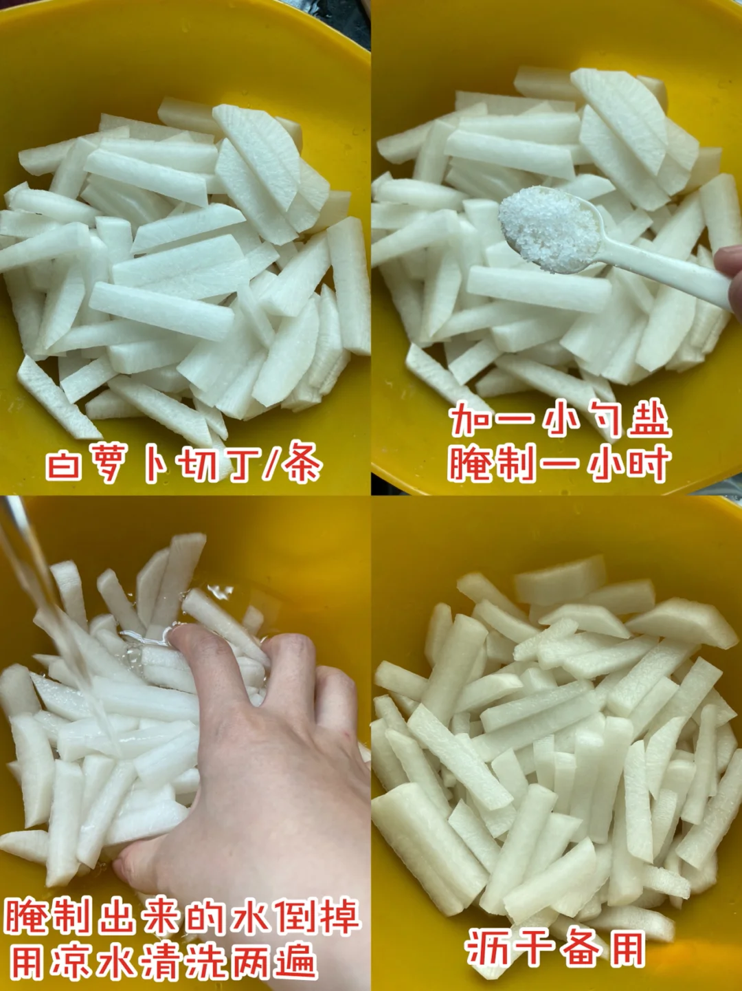 1️⃣白萝卜切丁/条 加一小勺盐腌制一小时