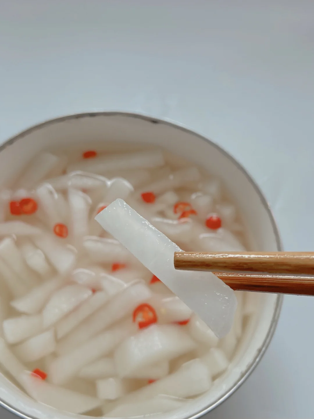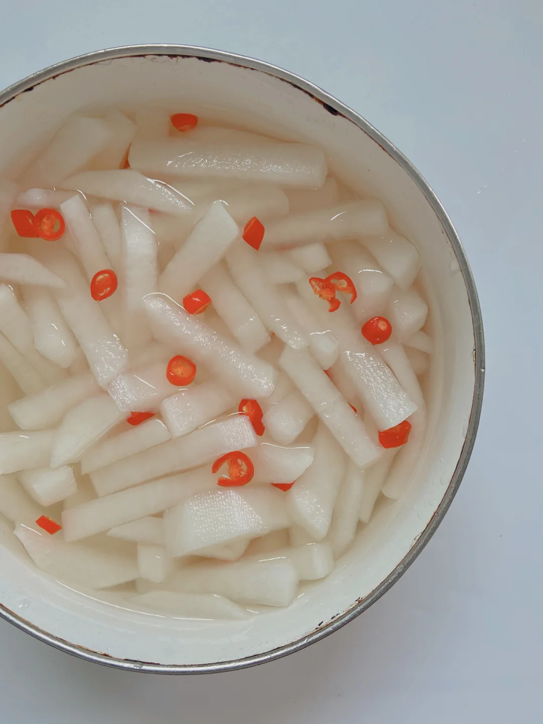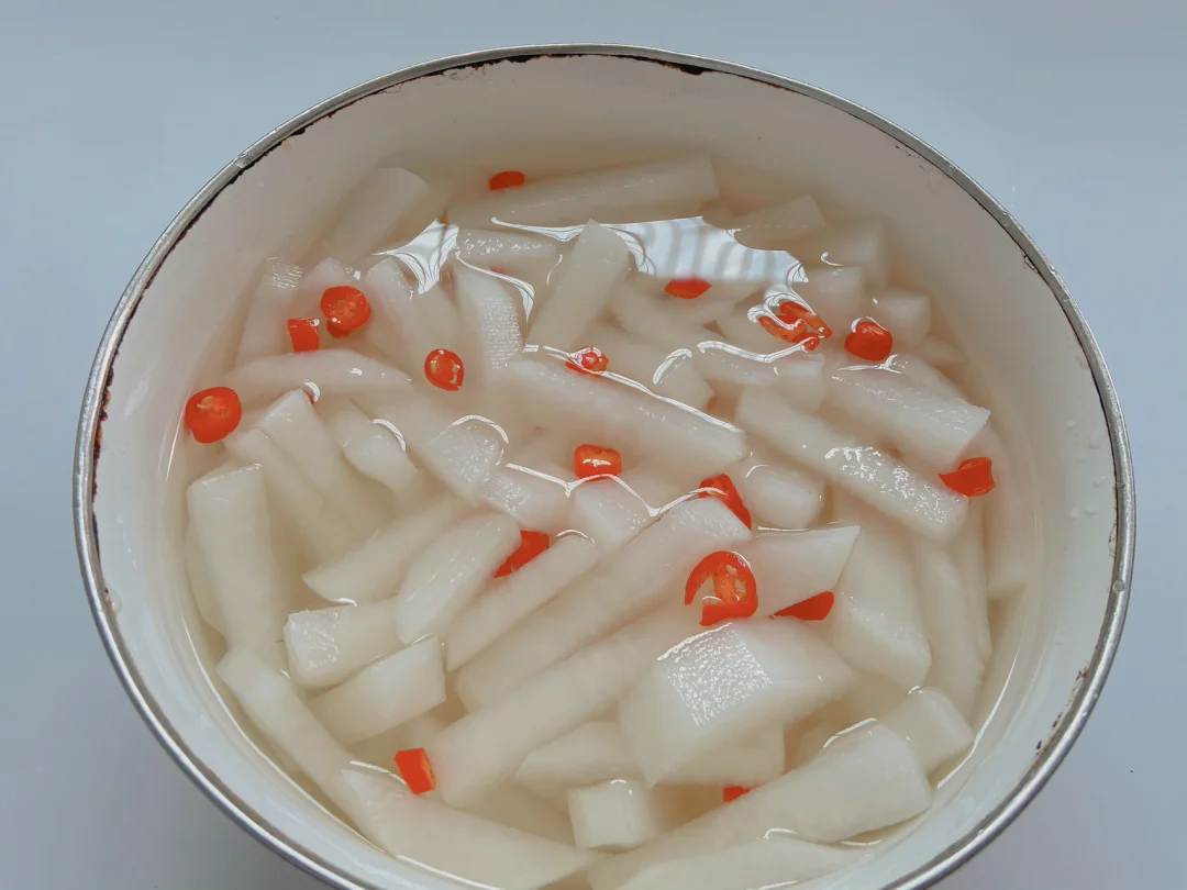 3️⃣锅里倒入水煮开+一勺白醋+一勺白糖 冷却后倒入萝卜里(喜欢吃辣的加点小米辣 喜欢甜一点就多加白糖 喜欢酸一点多加白醋)