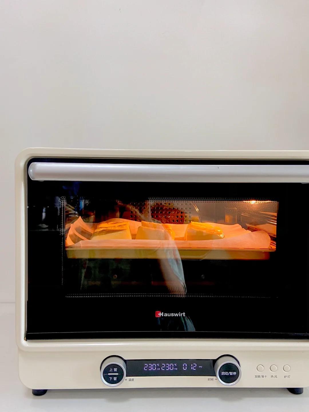 2️⃣3小时后倒扣切块 烤盘铺油纸 摆上烤盘 刷上蛋黄液 烤箱预热上下火230度 15钟左右 表面出现焦黄即可✔️