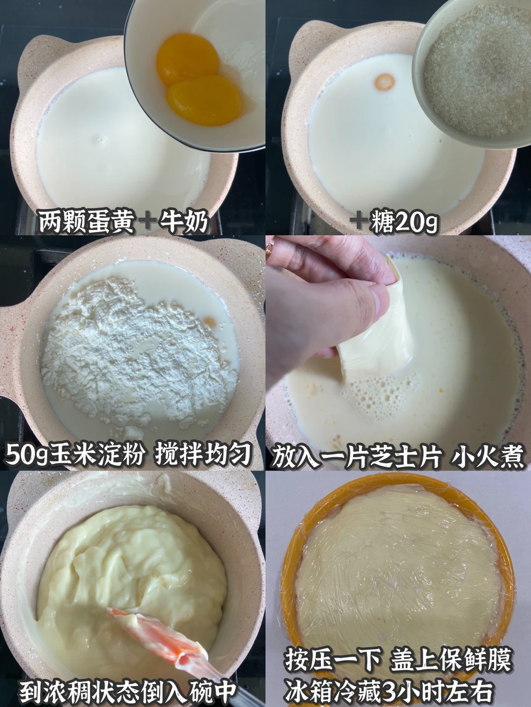 1️⃣两颗蛋黄➕牛奶➕糖➕玉米淀粉搅拌均匀 然后放入一片芝士片 小火煮到浓稠状态倒入碗中 按压一下 盖上保鲜膜冰箱冷藏3小时左右