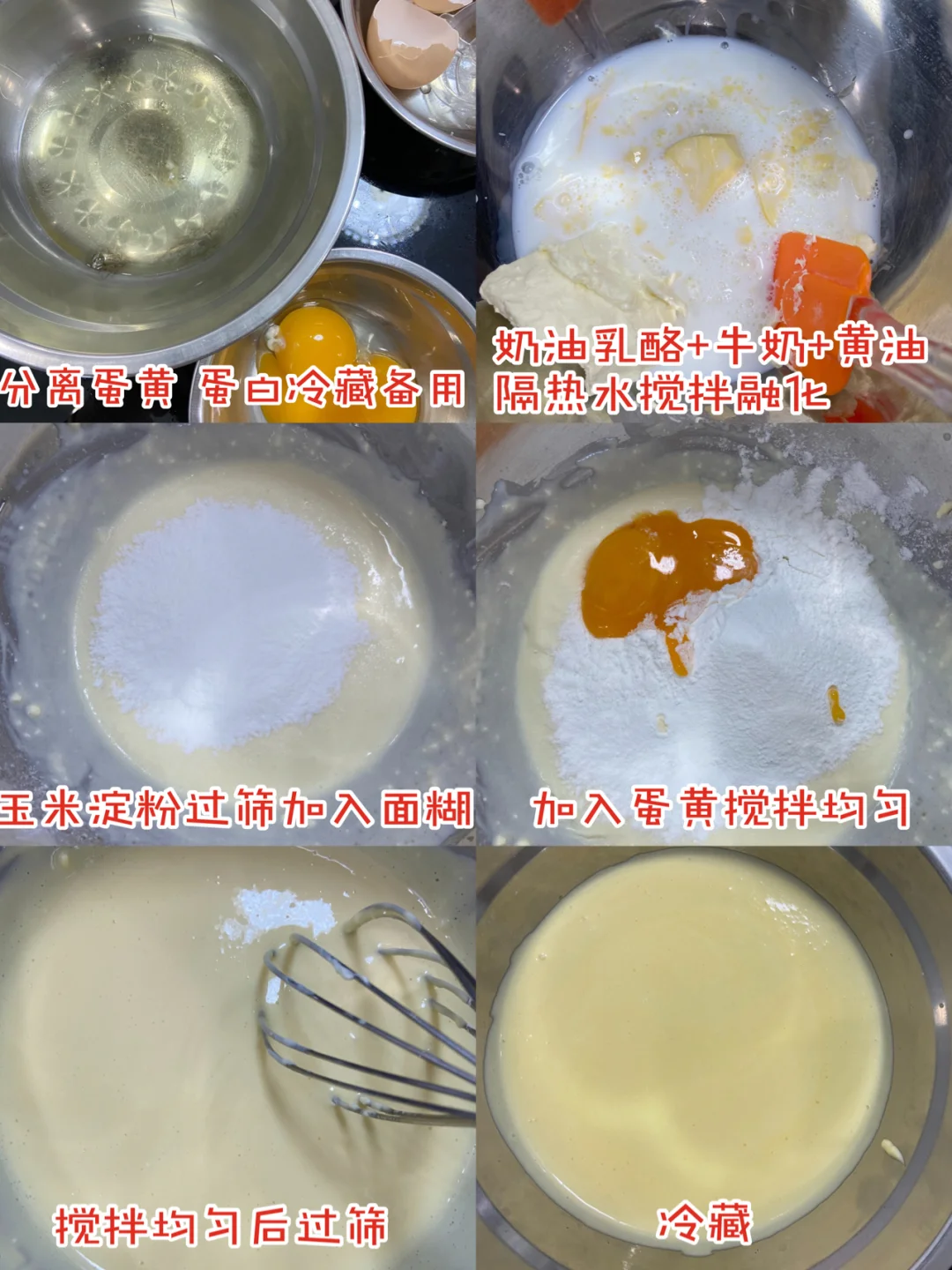 奶油奶酪130g 牛奶100g 黄油20g 鸡蛋2颗 砂糖35g 玉米淀粉45g