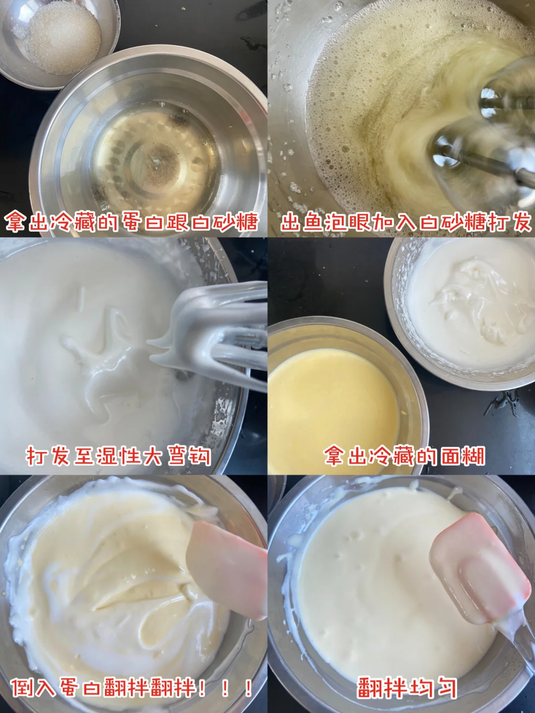 3️⃣蛋白➕白砂糖打发至举起打发器不滴落 湿性大弯钩 打发好加入面糊 翻拌翻拌!混合