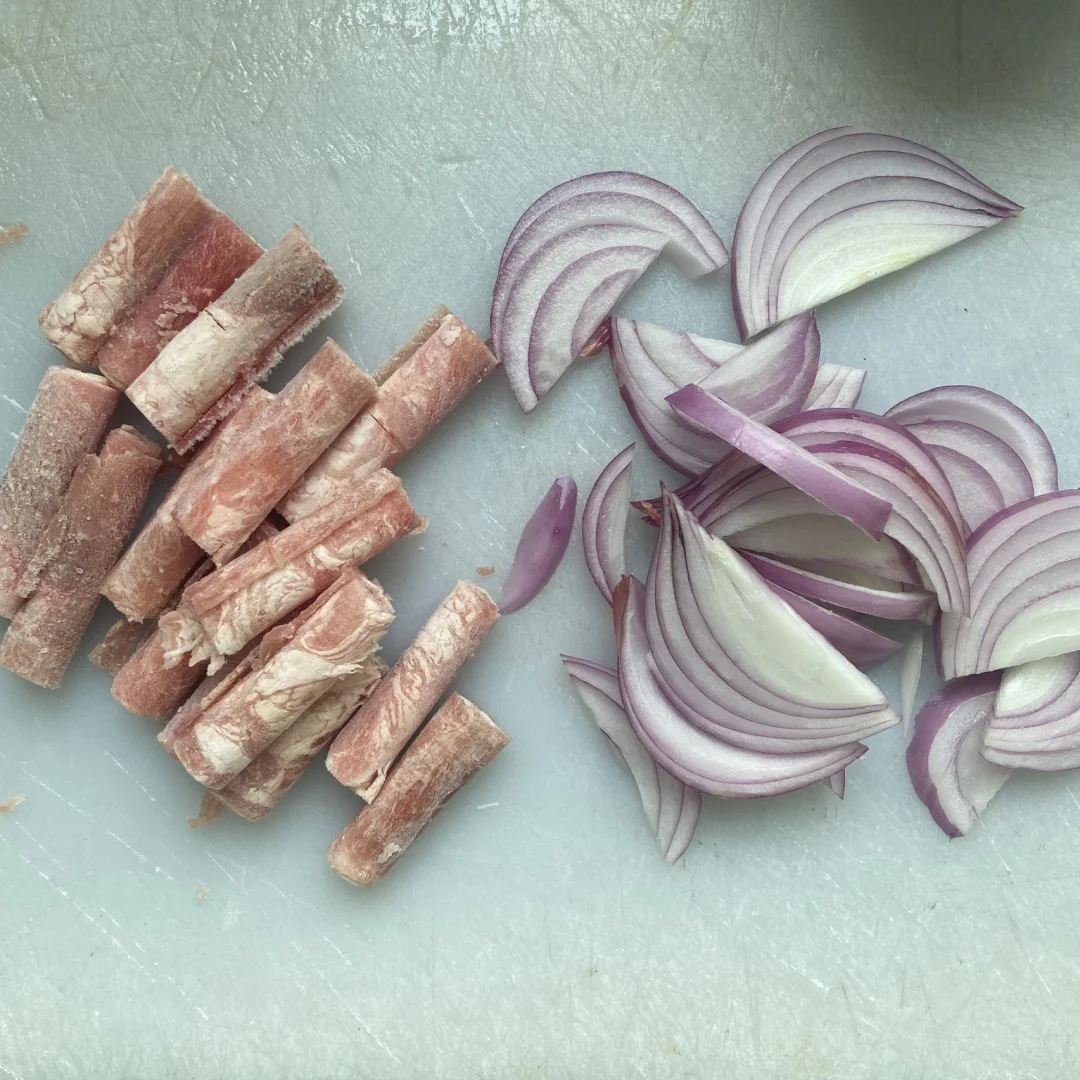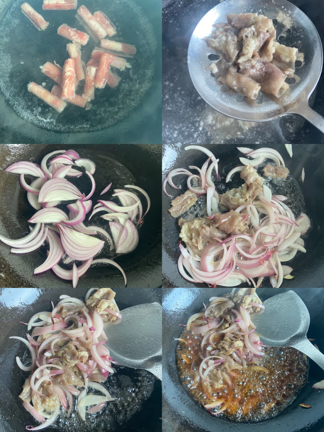 2️⃣肥牛卷放开水锅里焯至变色捞出 热锅放油 放入洋葱丝炒软 加入肥牛卷拌匀 加入金针菇 再倒入酱汁翻炒均匀煮开即可