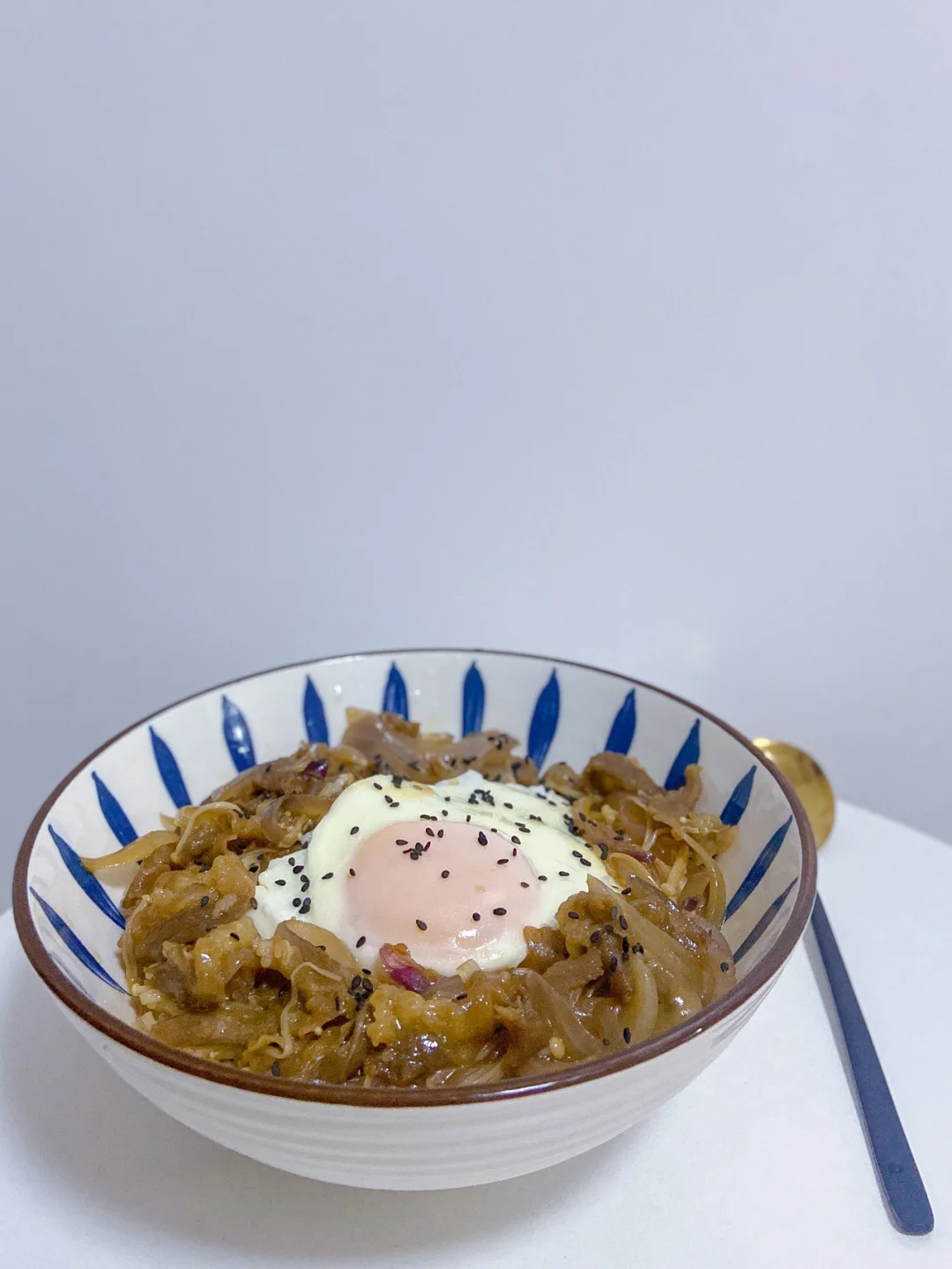 3️⃣再煎一个糖心蛋 盛碗米饭 把炒好的肥牛铺上去加入鸡蛋 撒上熟芝麻即可✔️