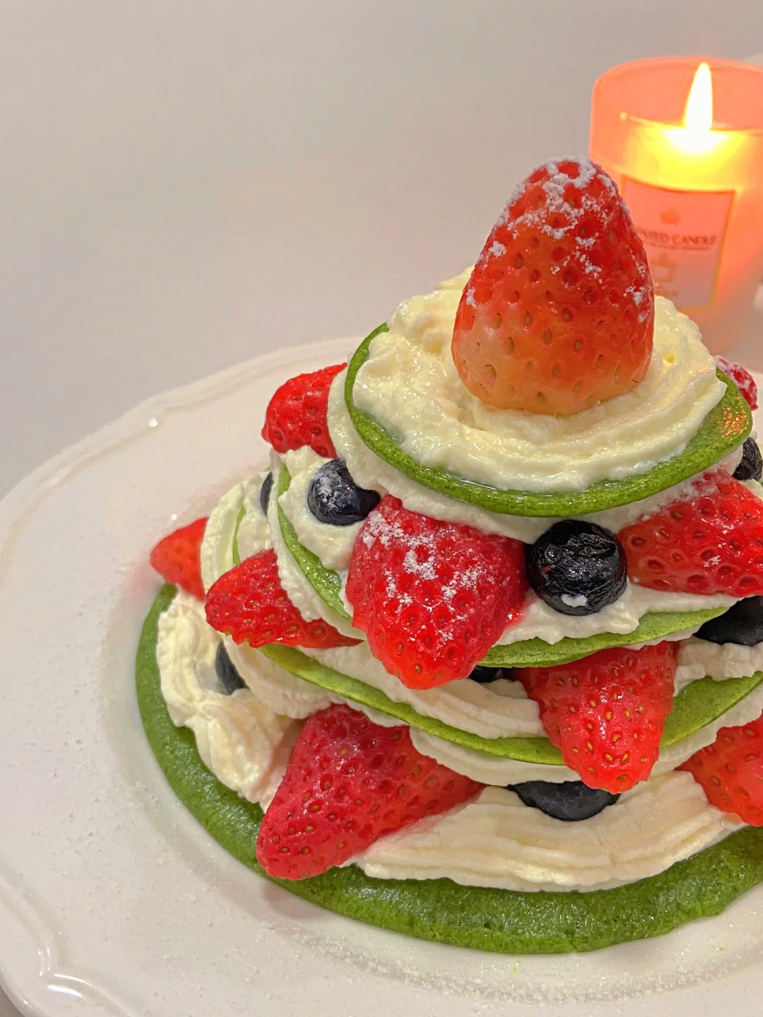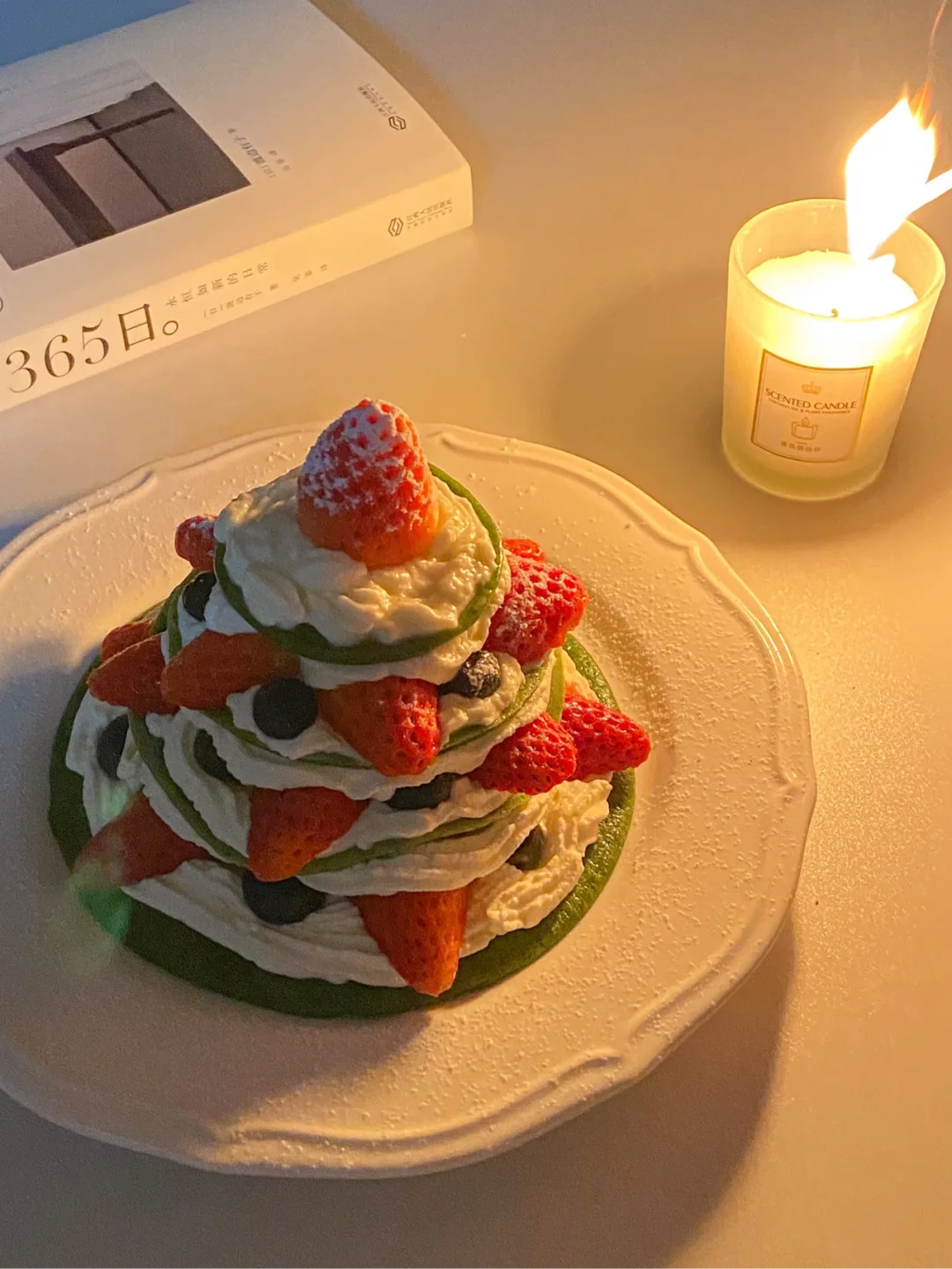 7️⃣松饼打底 挤上奶油 铺上水果 再挤上一层奶油 放上松饼 依次一层一层叠加 摆出圣诞树形状坠后撒上糖霜即可✅