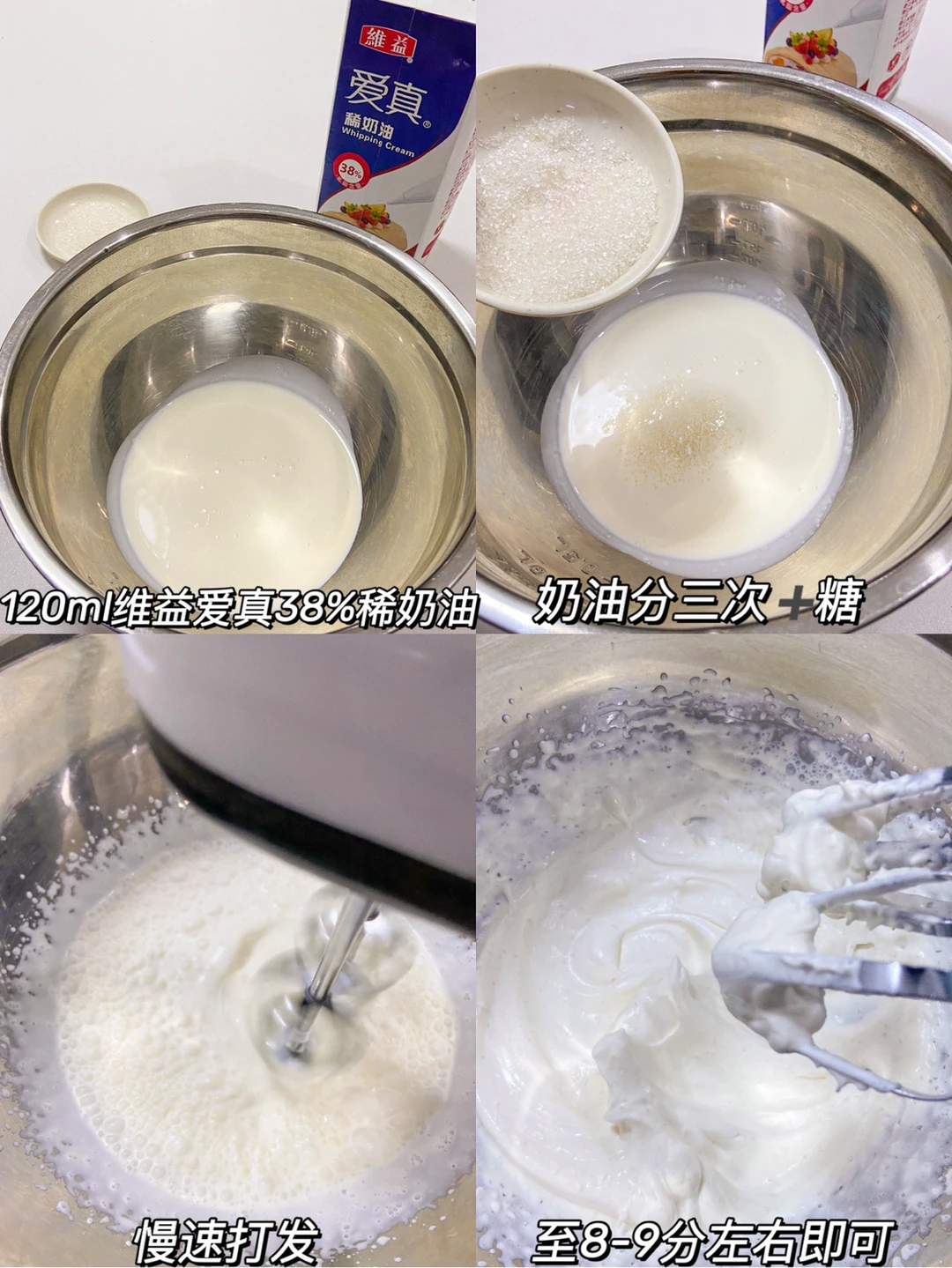 6️⃣奶油分三次➕糖慢速打发至8-9分左右装入裱花袋