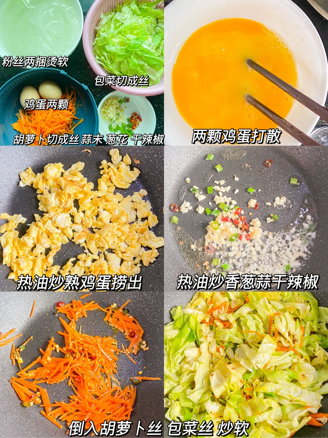 过年放假在家里做了好几次的包菜炒粉丝 每次做起来都秒光 我老公天天夸真好吃~分享给大家😊 准备食材✨✨✨✨✨ 鸡蛋两颗 包菜半个 粉丝两捆 胡萝卜半根 蒜末 葱花 干辣椒 做法✨✨✨✨✨ 1️⃣胡萝卜 包菜切成丝 粉丝用开水烫软 鸡蛋打散炒熟捞出 2️⃣热油炒香葱蒜干辣椒 倒入胡萝卜丝 包菜丝 炒软 3️⃣加入烫好的粉丝 ➕一勺生抽➕一勺蚝油➕一勺老抽➕一小勺盐➕一小勺味精 倒入炒好的蛋花 翻炒均匀即可 简单又快手的一道菜就完成啦😘