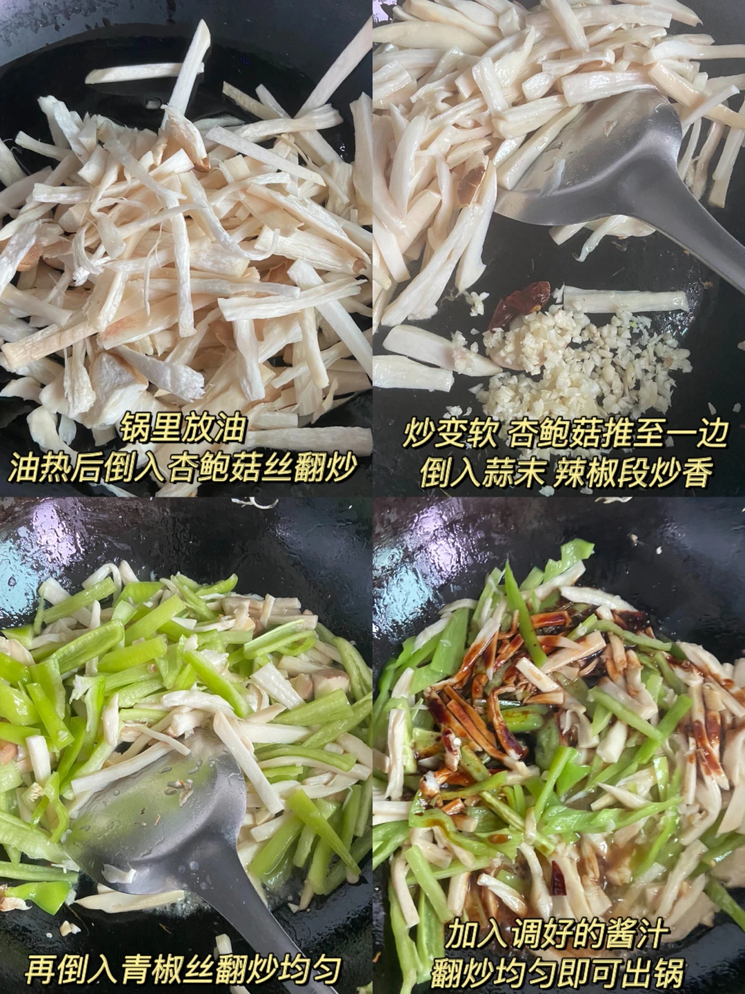 3️⃣锅里放油 油热后倒入杏鲍菇丝翻炒 炒变软4️⃣把杏鲍菇推至一边 倒入蒜末 辣椒段炒香 再倒入青椒丝翻炒均匀 加入调好的酱汁翻炒均匀即可出锅。