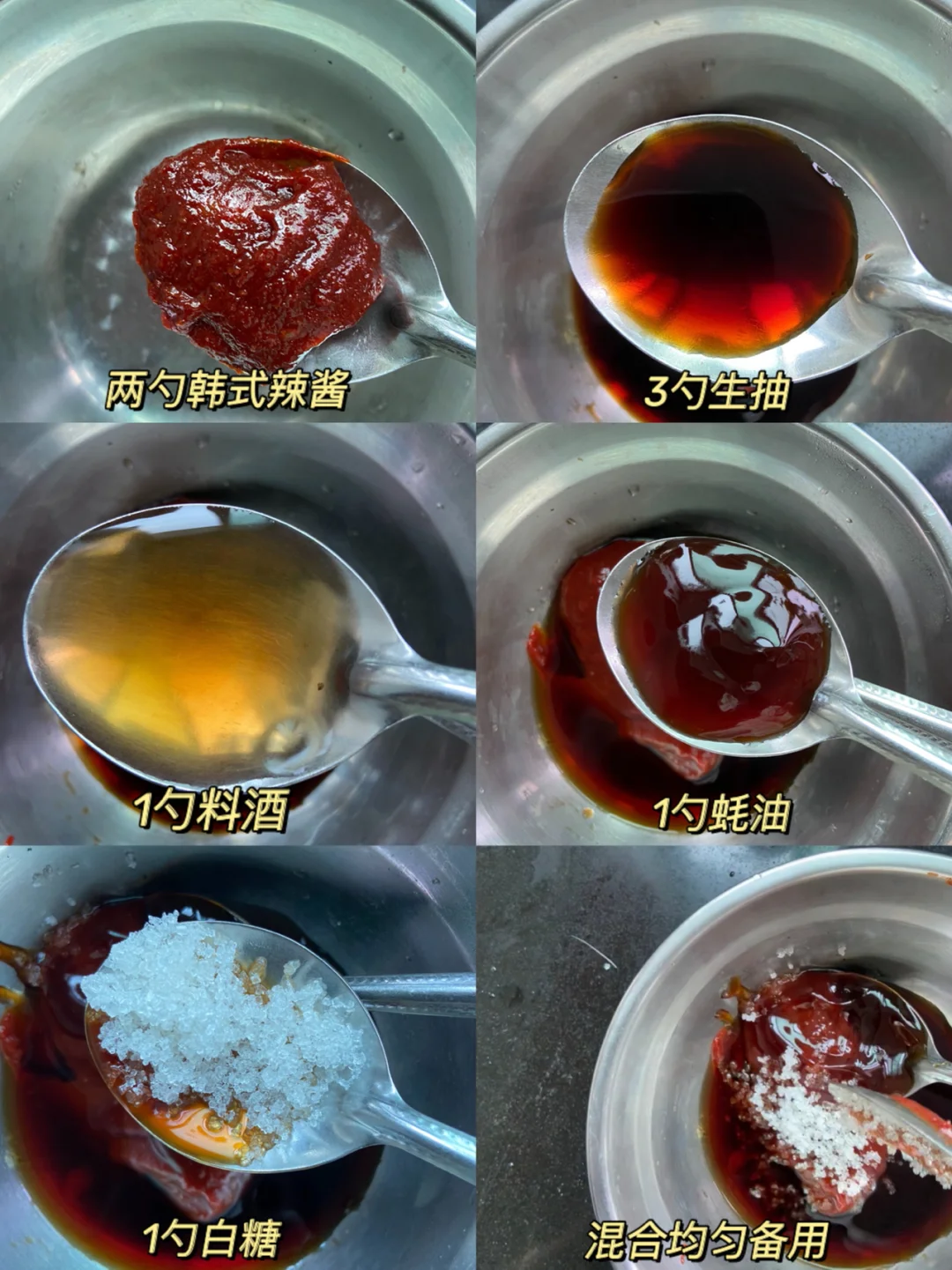 1️⃣调酱汁:2勺韩式辣酱十3勺生抽十1勺料酒十1勺蚝油十1勺糖,搅拌均匀备用