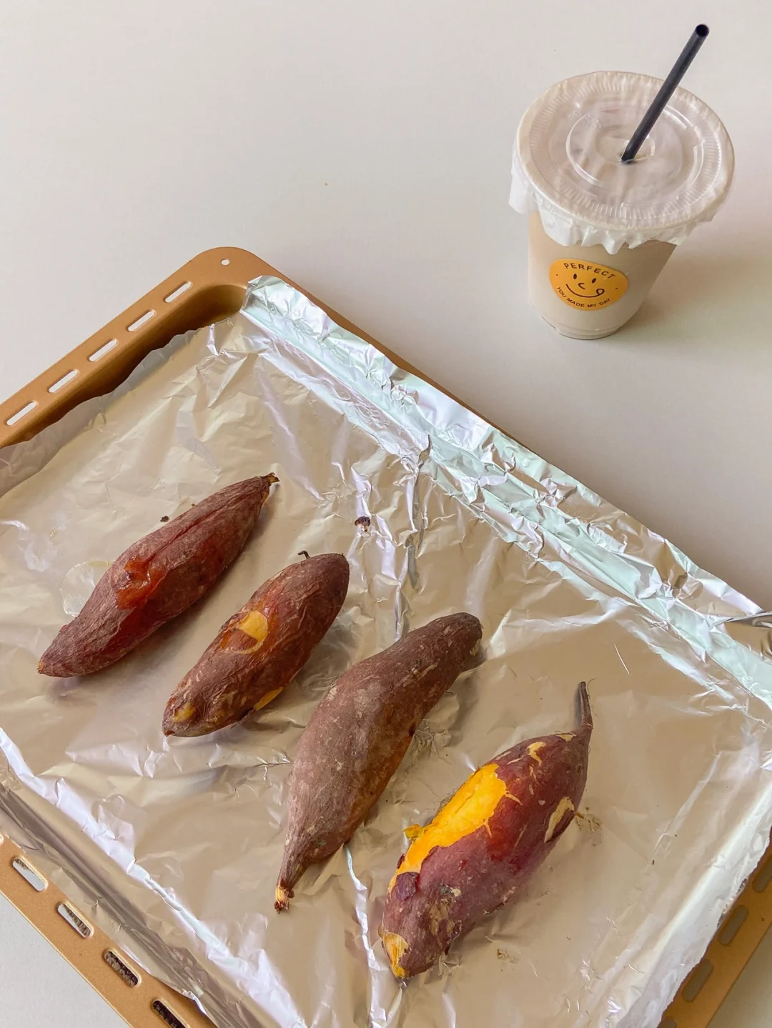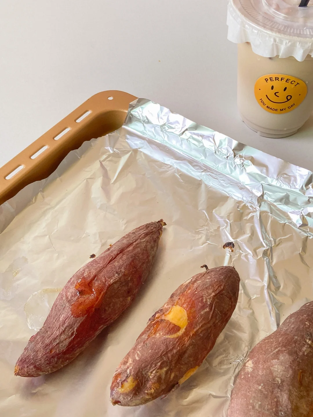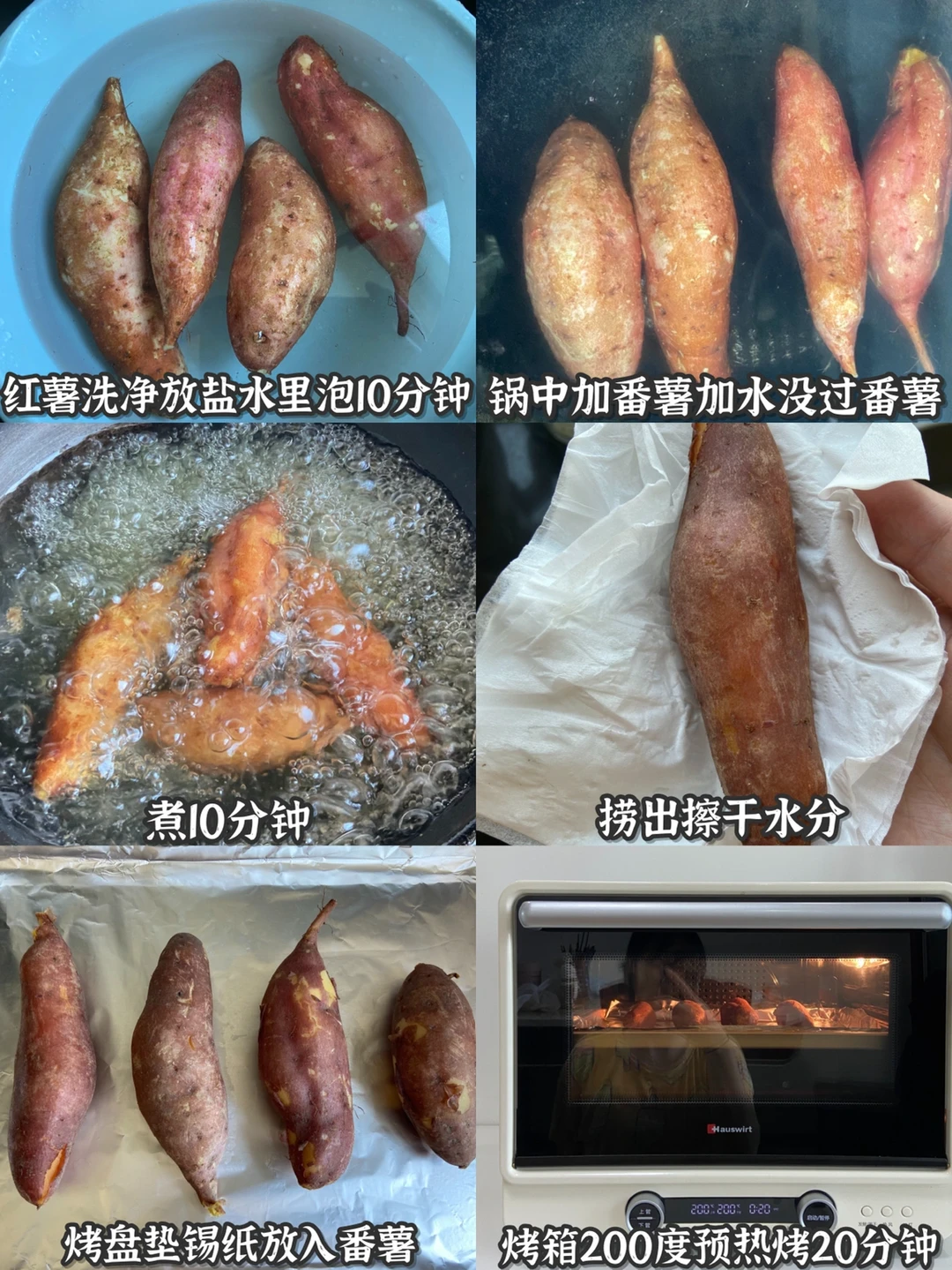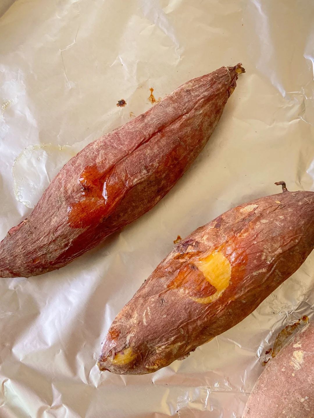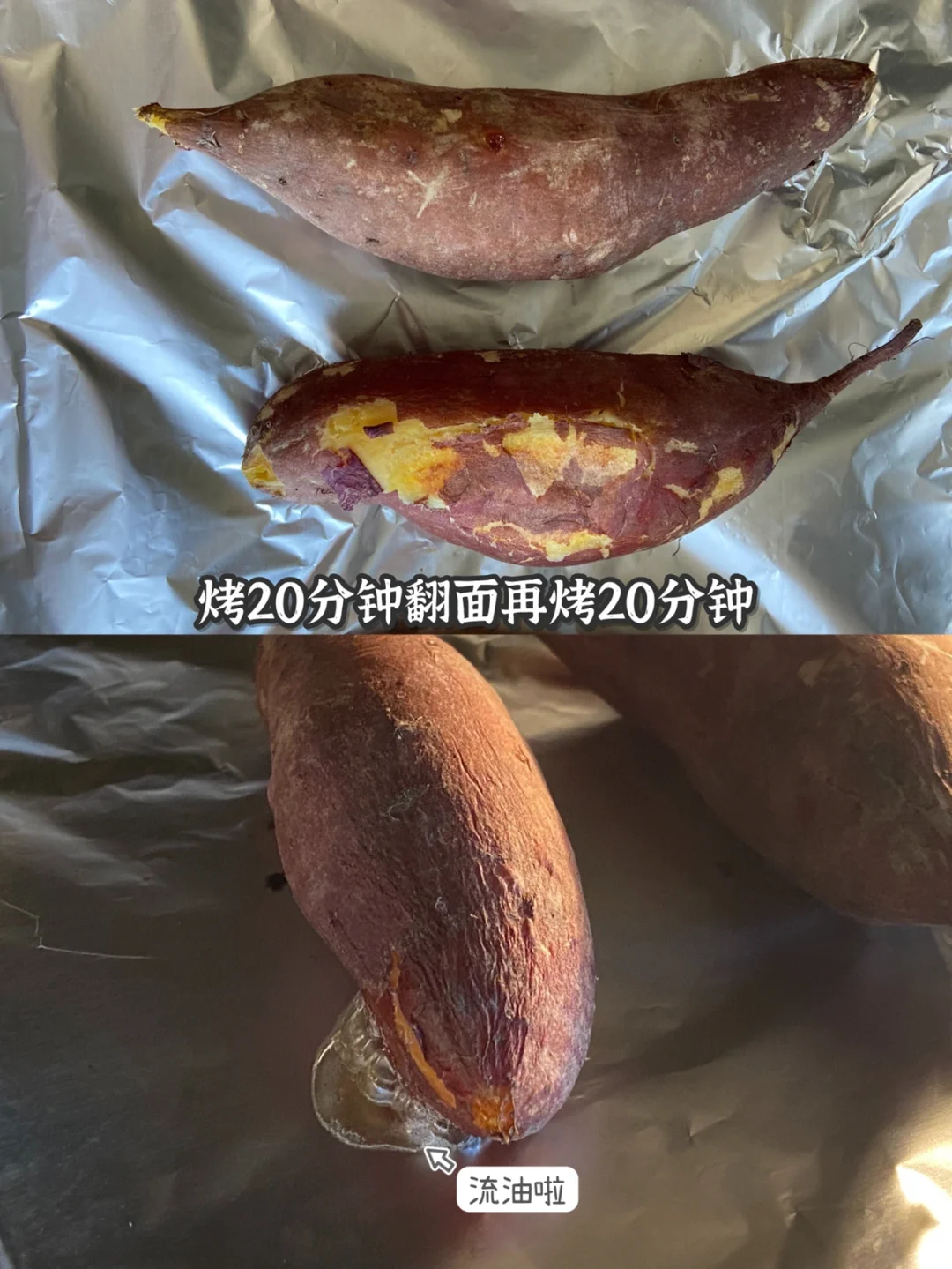 3️⃣烤箱200度预热5分钟 烤盘垫锡纸放入番薯烤20分钟翻面再烤20分钟即可