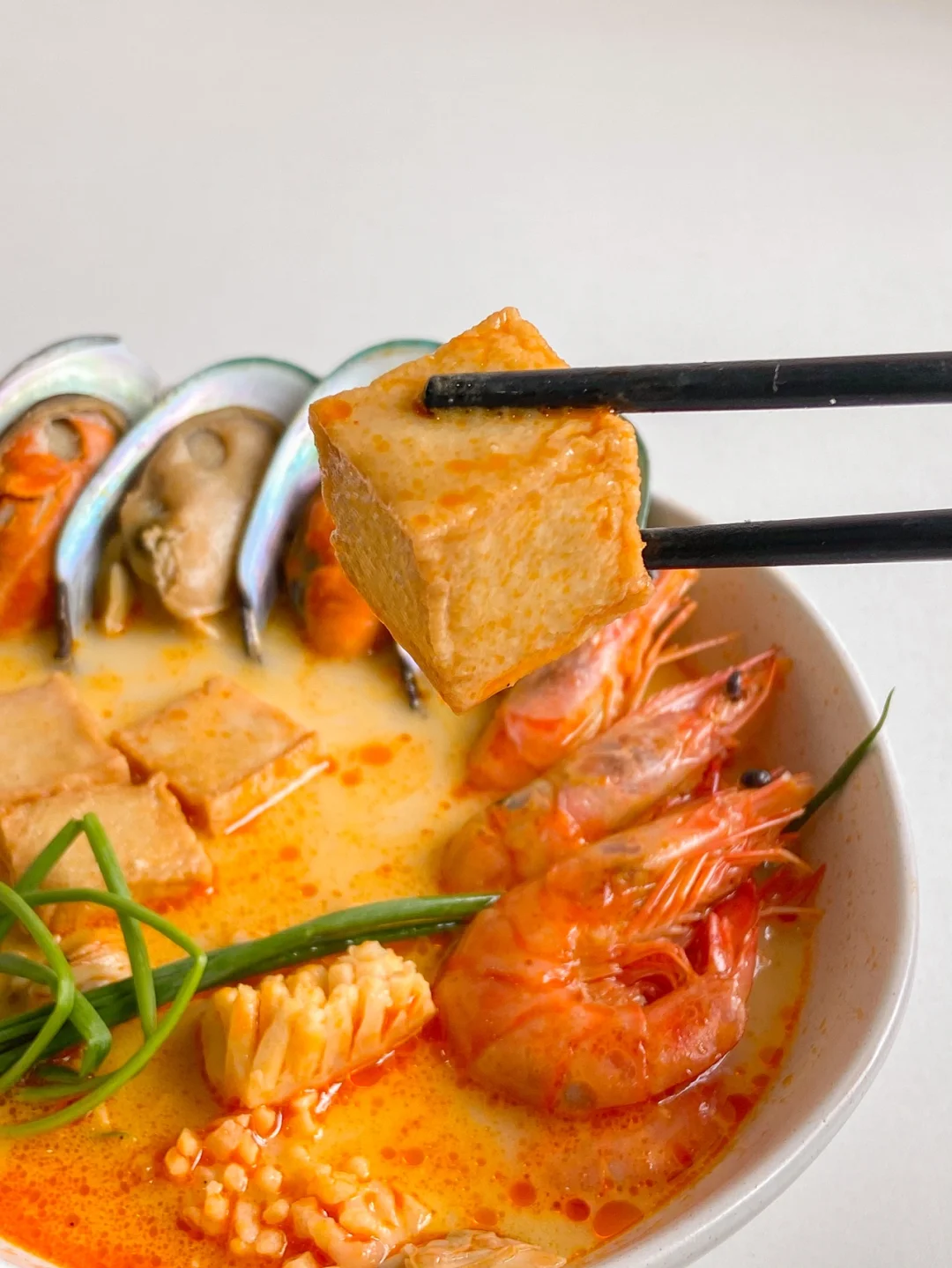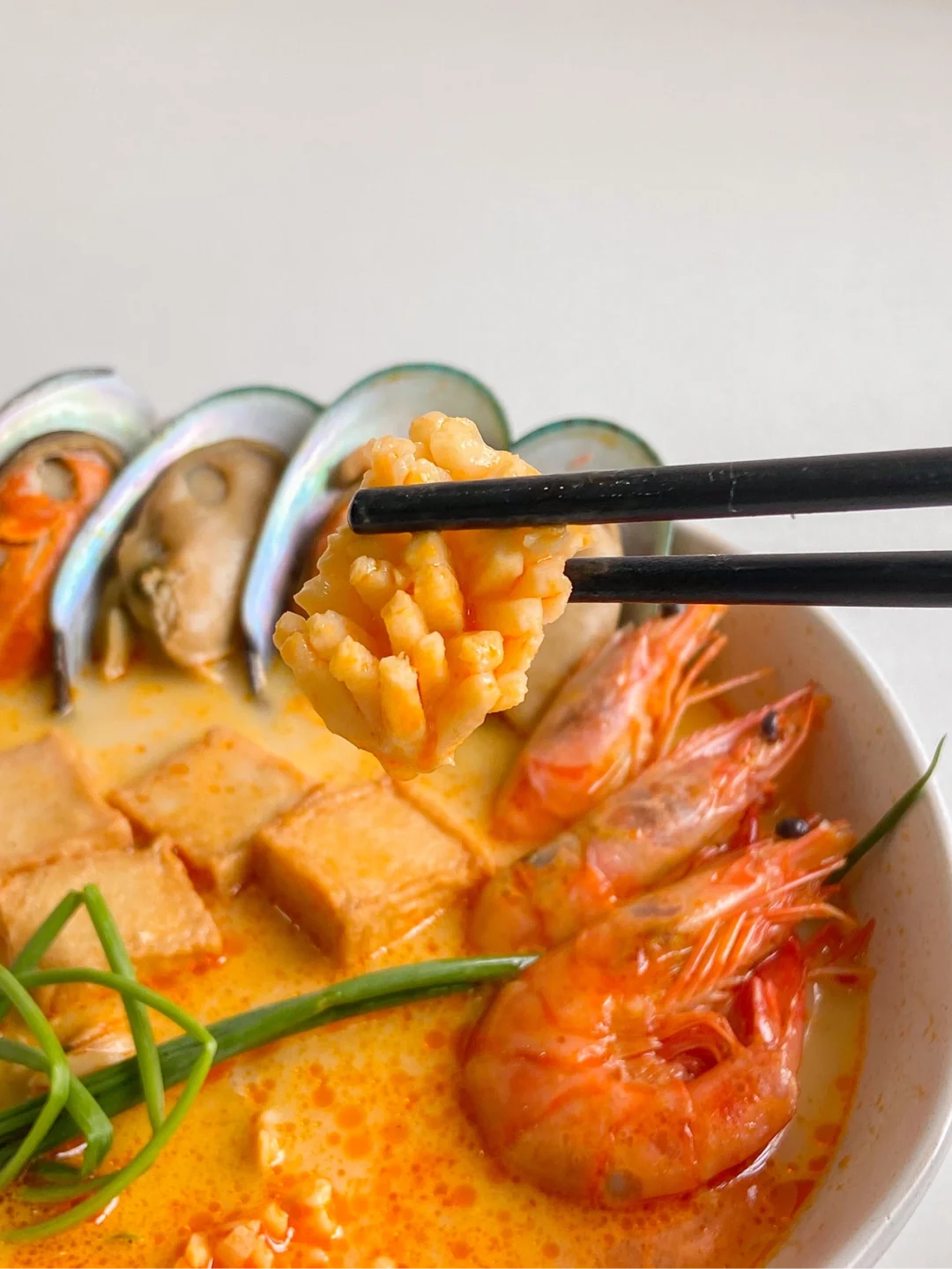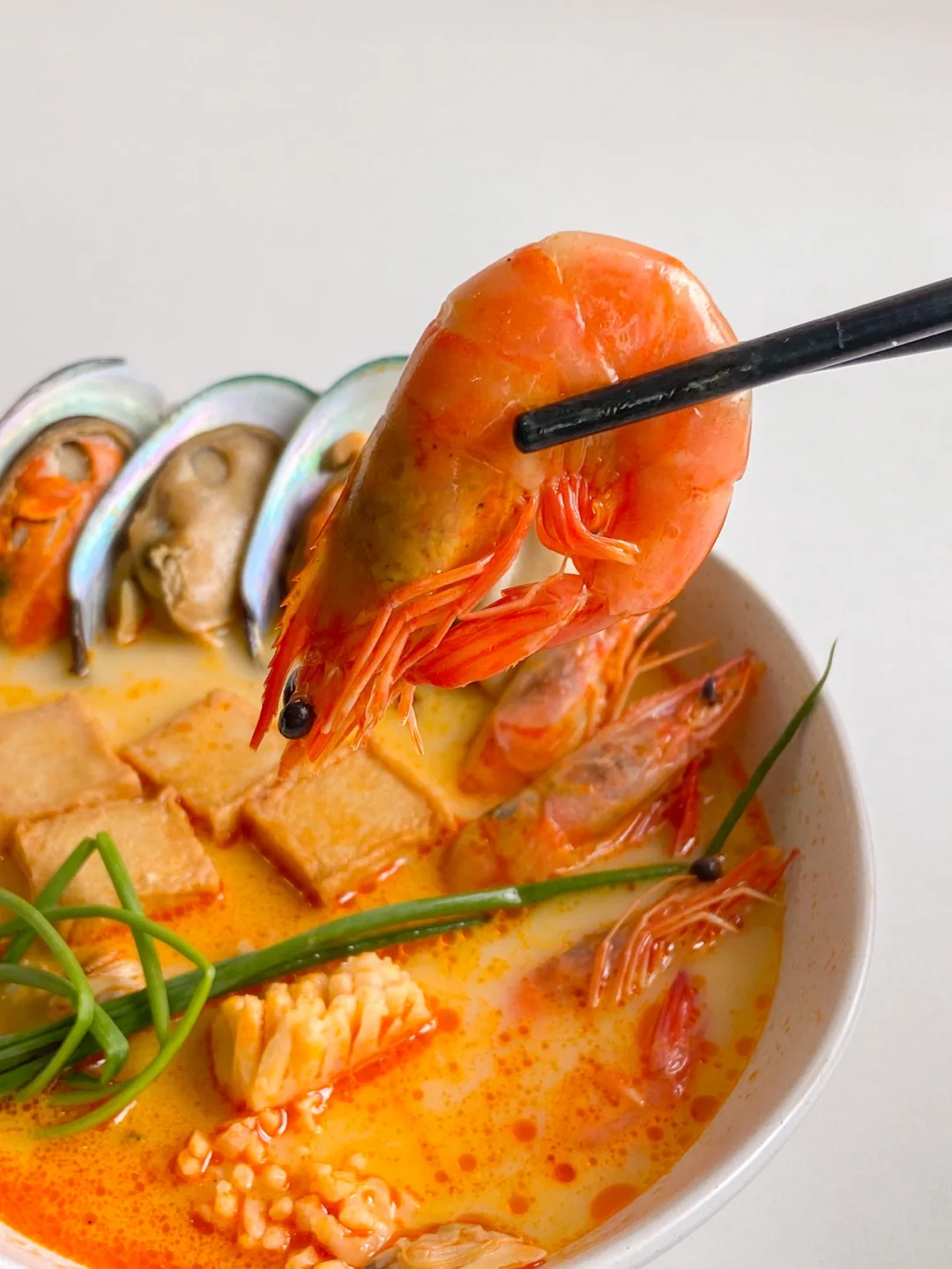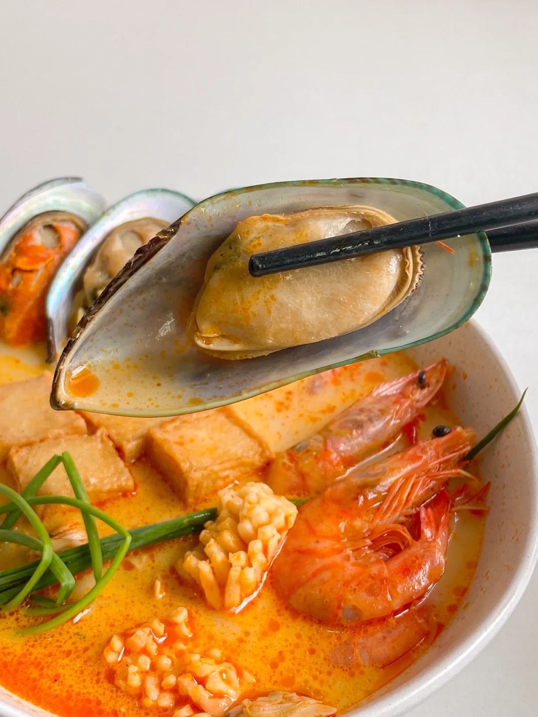 红红的汤汁看着就食欲爆棚 一口入魂 还有清新的柠檬香和虾贝!自带食材新西兰青口贝、湛江白虾、鱿鱼花、鱼豆腐、花甲肉,超级丰富!而且免了出门买菜的烦恼 这一点真的太棒啦😋开袋即可烹,10分钟搞定美味大餐👍🏻