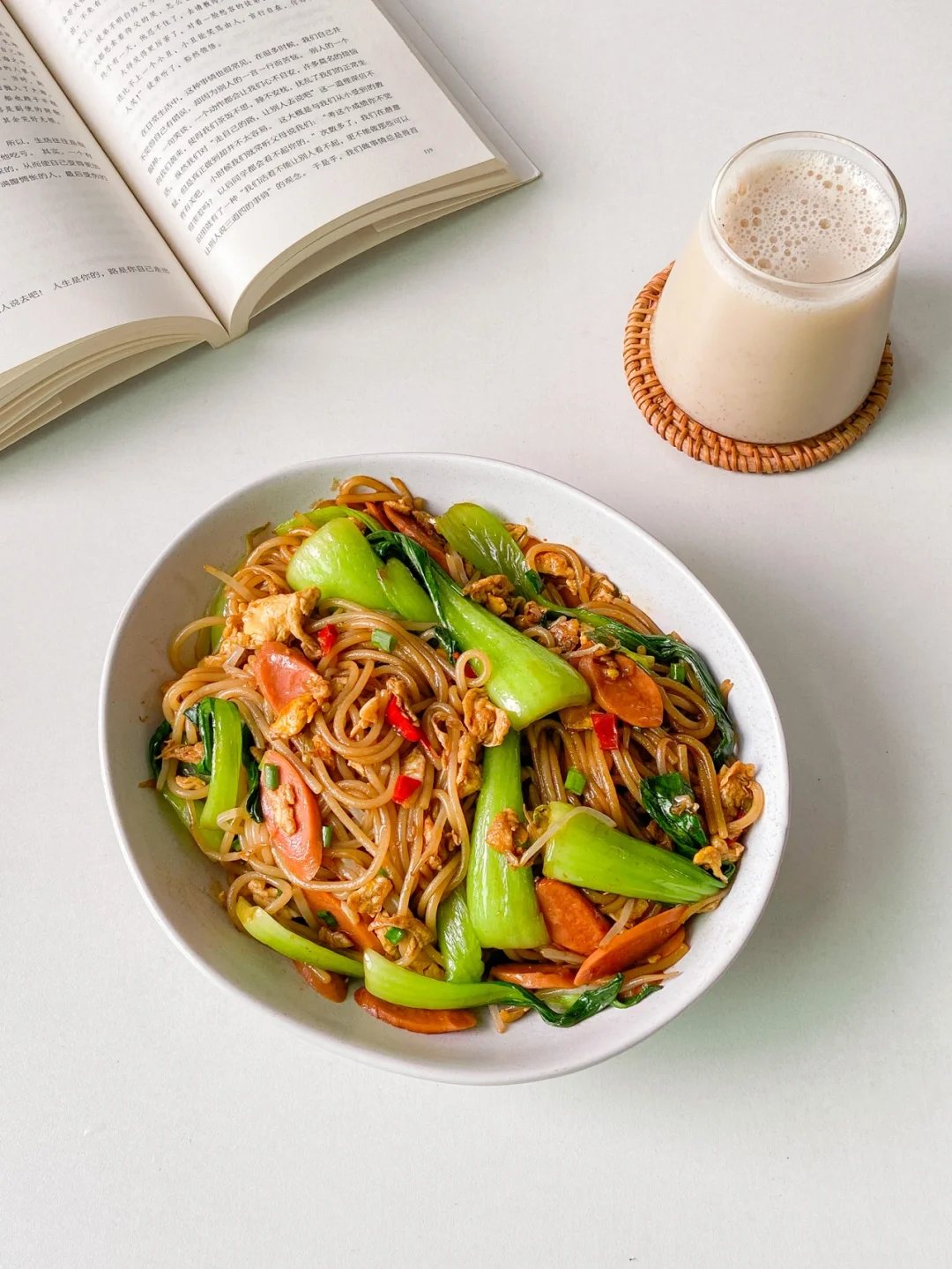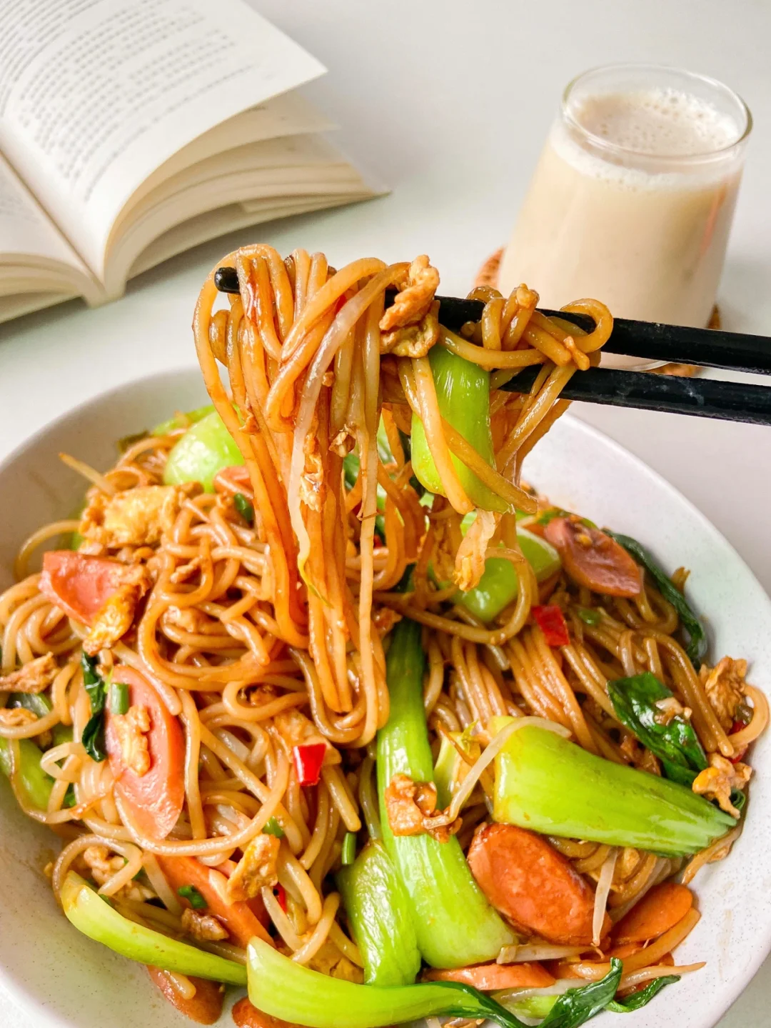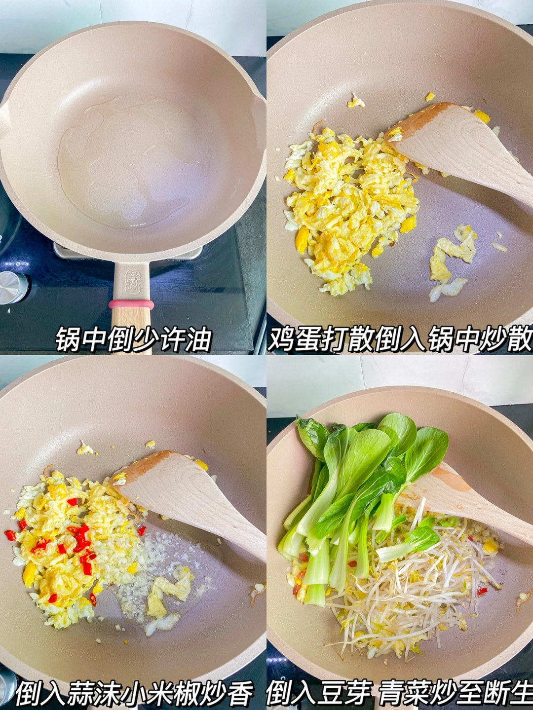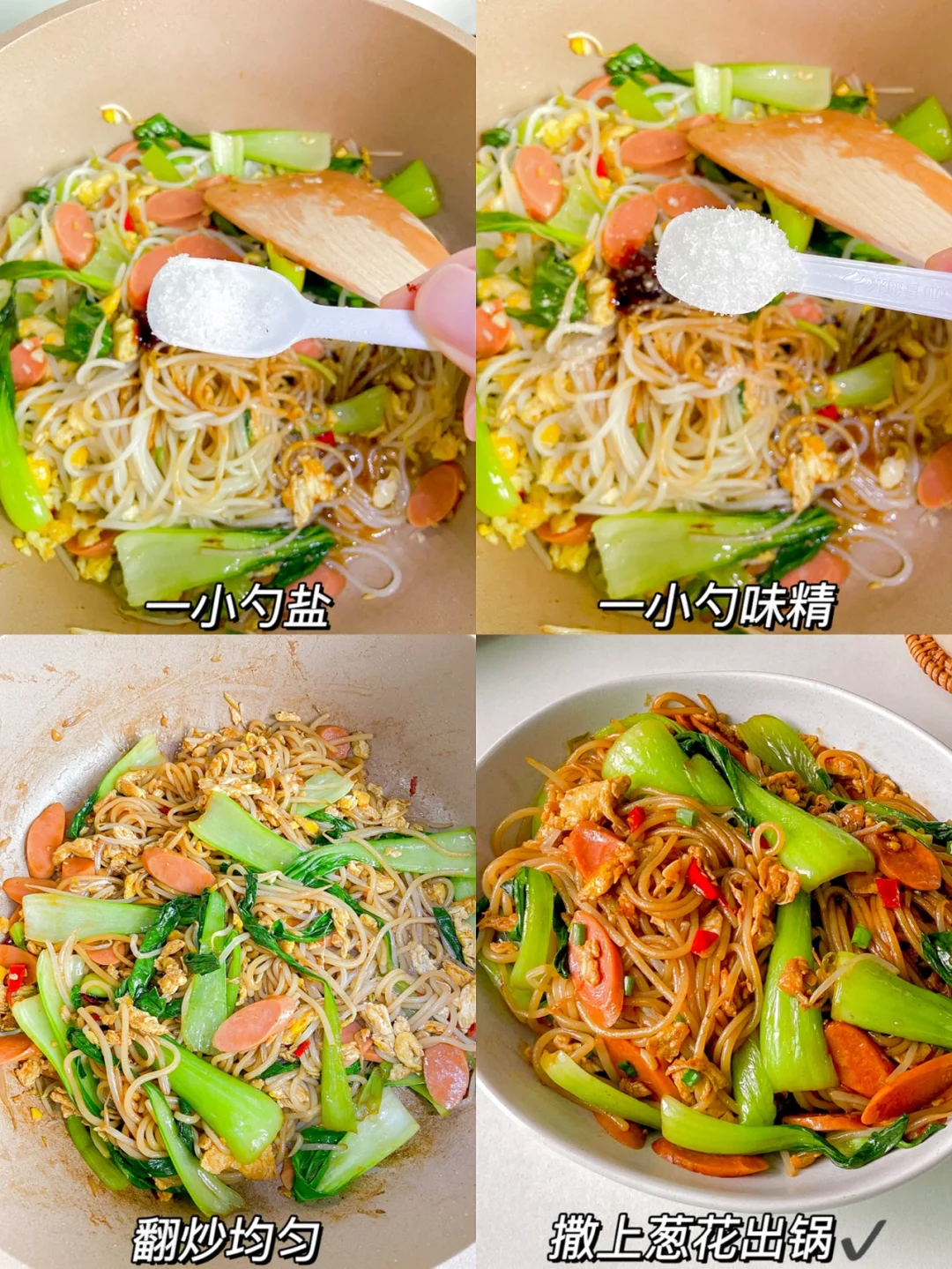 4️⃣倒入豆芽 青菜炒至断生 倒入米粉 香肠翻炒均匀➕2勺生抽➕1勺老抽➕1勺蚝油➕一小勺盐➕一小勺味精翻炒均匀 撒上葱花就可以啦
