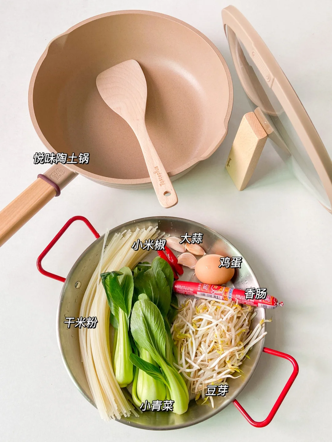 米粉 豆芽一把 小青菜4颗 火腿肠一根 鸡蛋一颗 大蒜三片 小米椒2条
