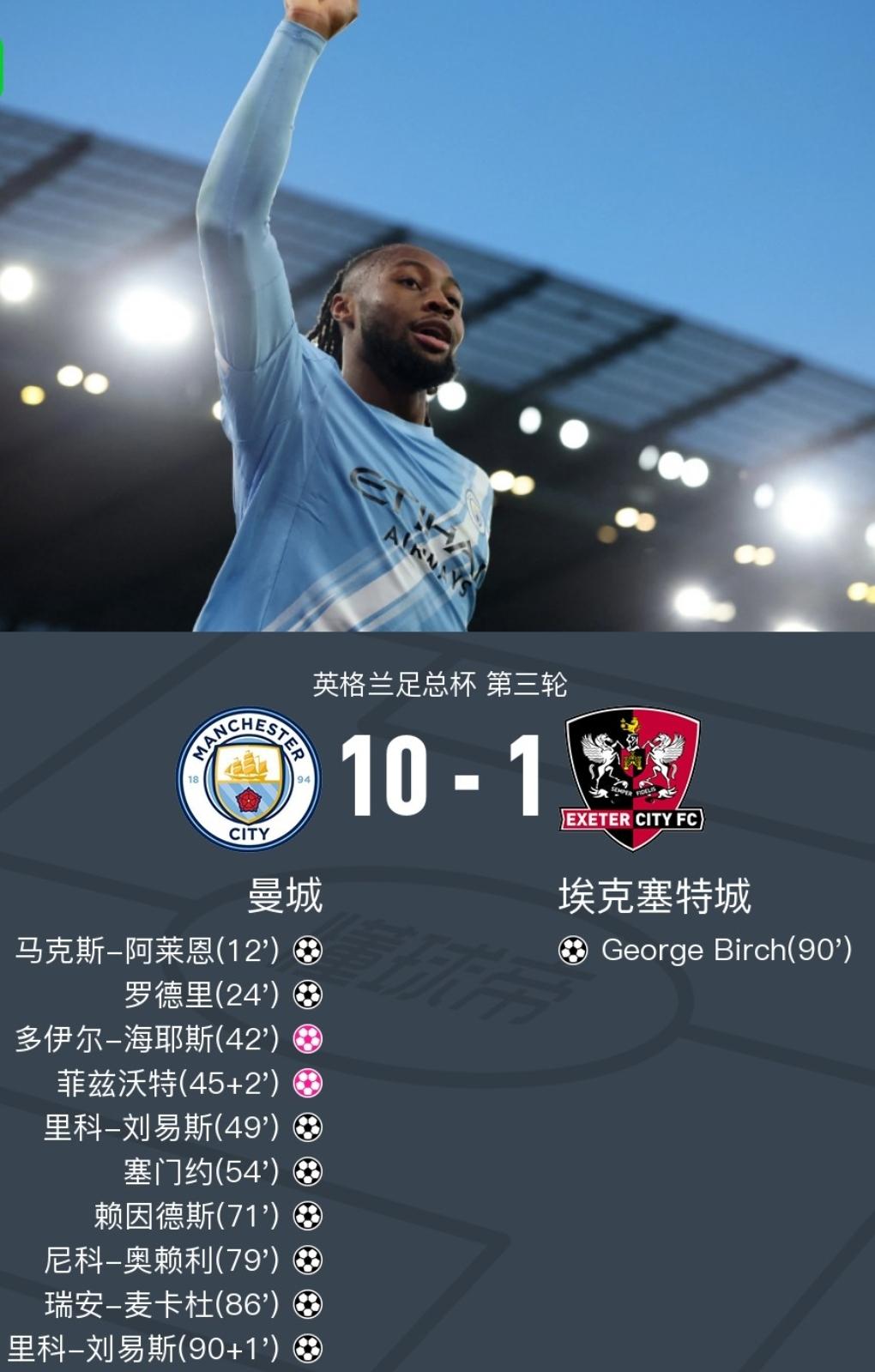 10-1,曼城“杀疯了”!不过却有一点美中不足! 是的,你没有看错,比分就是10-1,曼城进球数上双。 这个比分既在意料之外,又在情理之中。 当我们对比两队的身价,毫不夸张的说,曼城队内众多球星身价的零头,都比对面所有球员身价总和要高。作为英超传统豪门,对阵英甲级别的球队,曼城能够进球上双,也在情理之中。值得一提的是,这也是自1986年以来,首次有英格兰顶级联赛球队进球上双。 其中加盟曼城后完成首秀的塞门约传射建功,里科-刘易斯梅开二度,阿莱恩、罗德里、赖因德斯、奥赖利、麦卡杜等人分别破门。 比赛如果说还有美中不足的,那便是作为正印中锋的哈兰德,没能在本场比赛取得进球,不过相较于个人进球,相信哈宝更开心的是比赛的胜利。