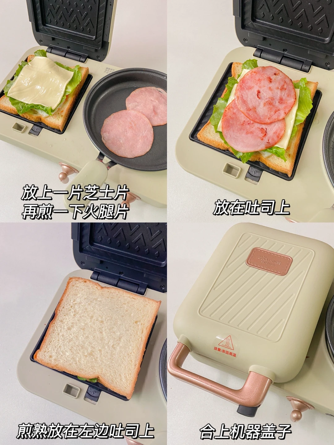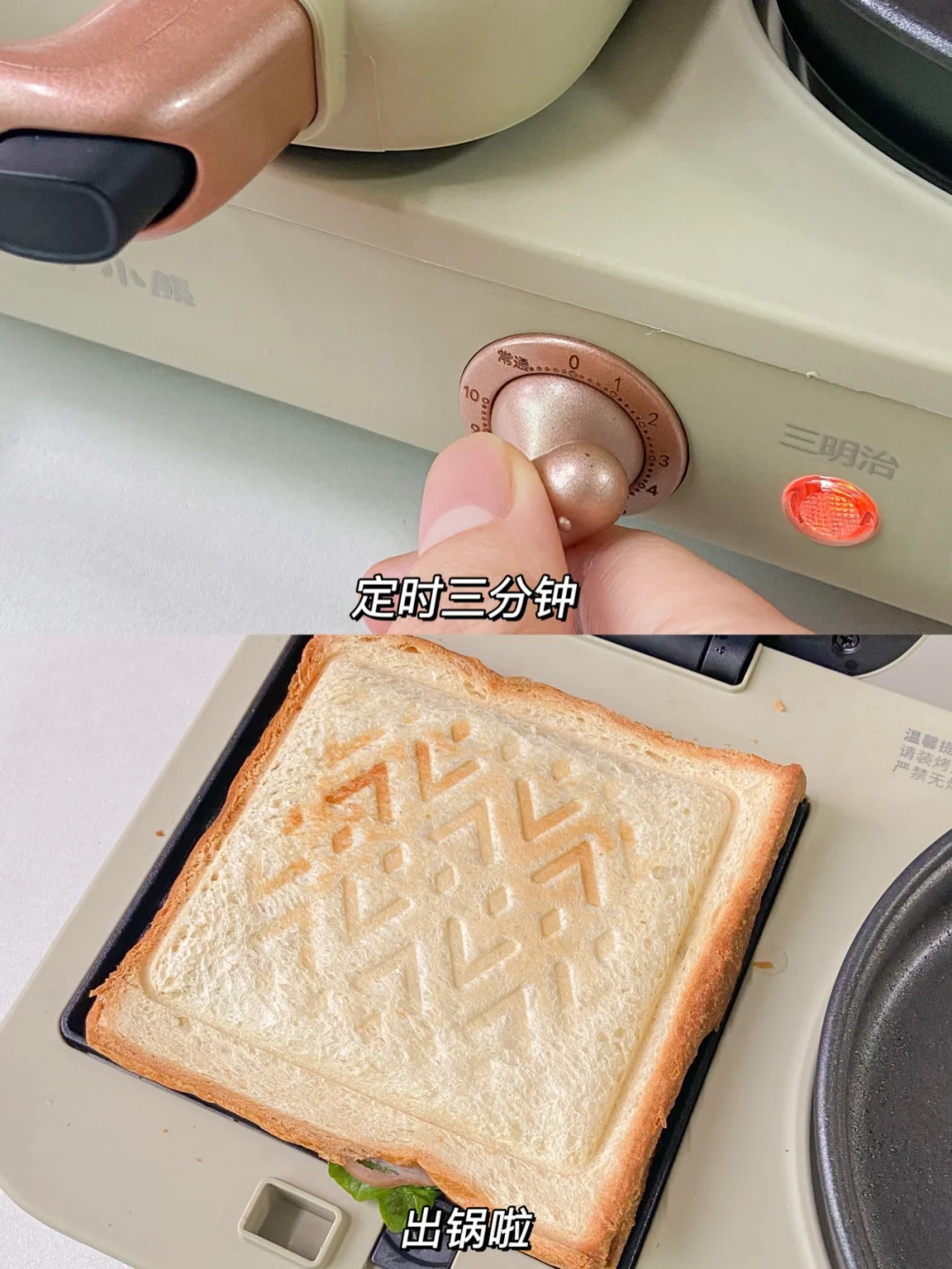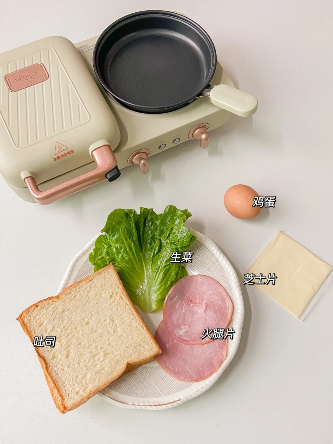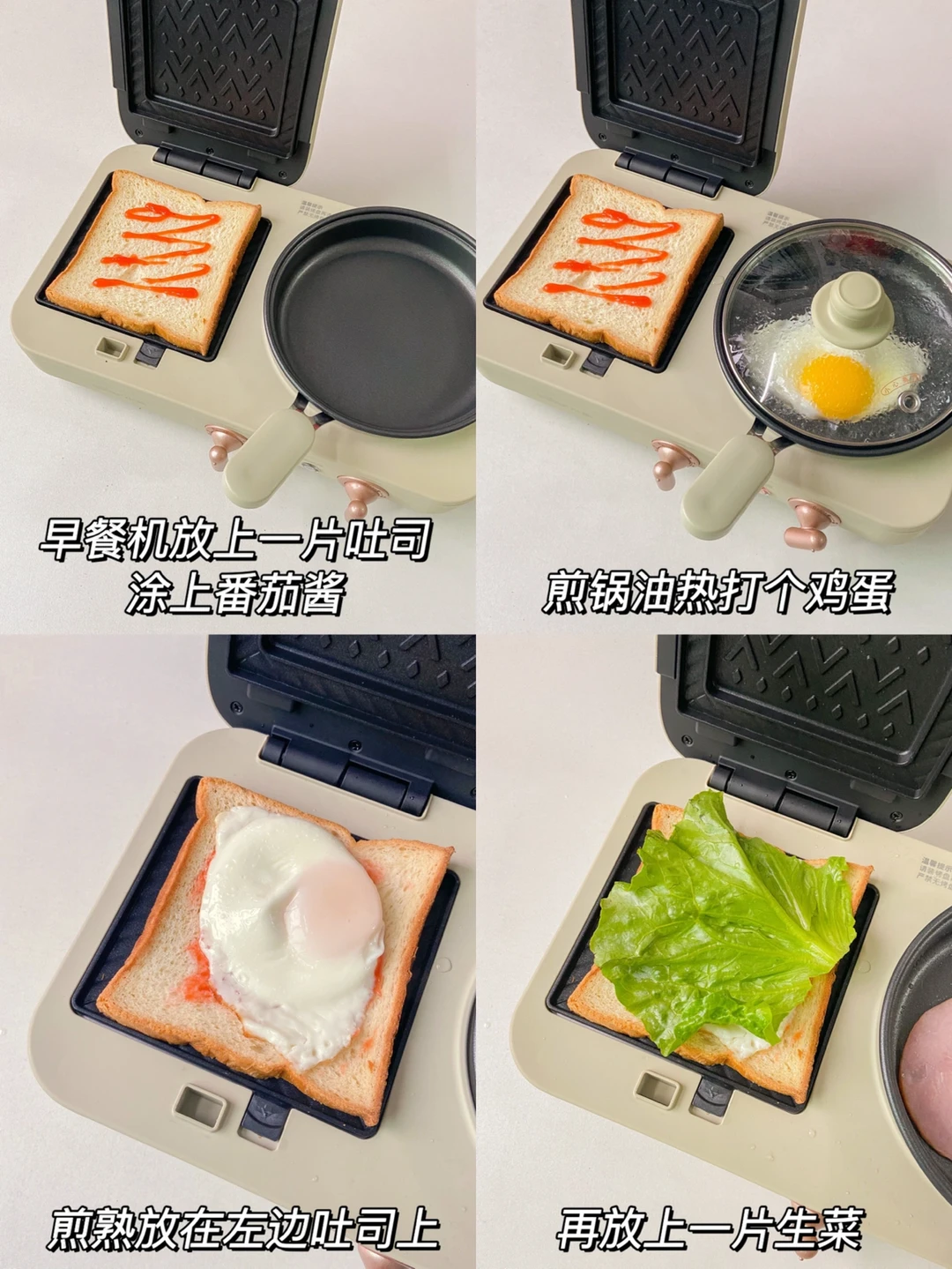 1️⃣早餐机放上一片吐司涂上番茄酱 煎锅油热打个鸡蛋 煎熟放在左边吐司上 再放上一片生菜和芝士片