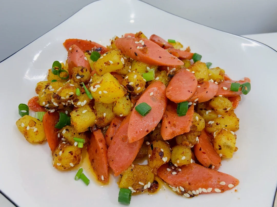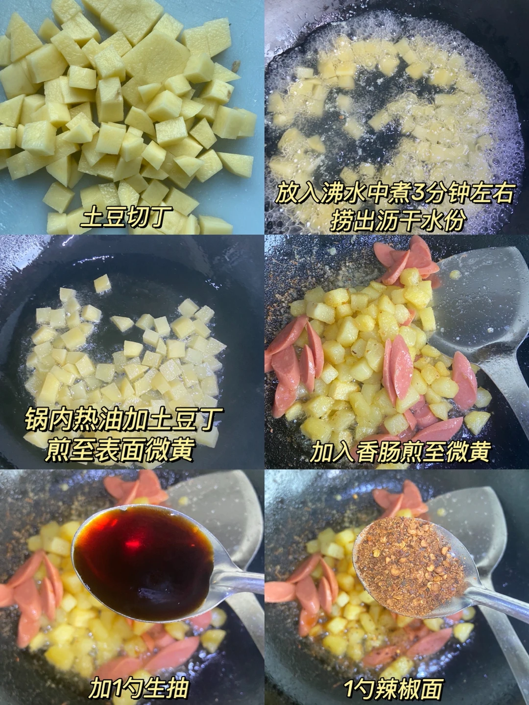 2️⃣锅内热油加土豆丁煎至表面微黄 加入香肠煎至微黄