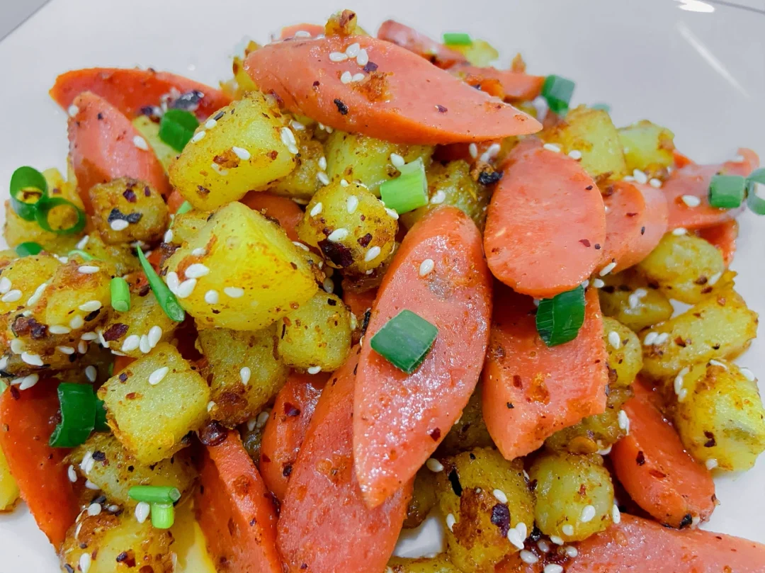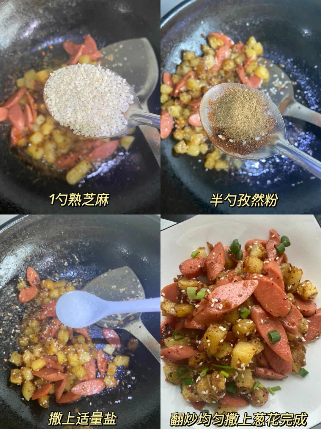 大土豆1个 香肠2根 生抽1勺 辣椒面1勺 孜然粉半勺1勺 芝麻1勺 盐适量