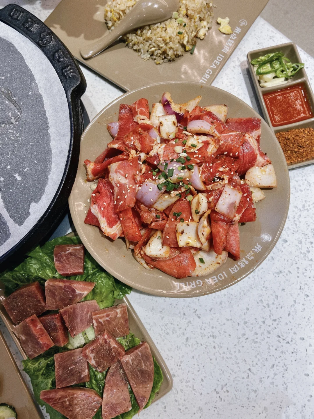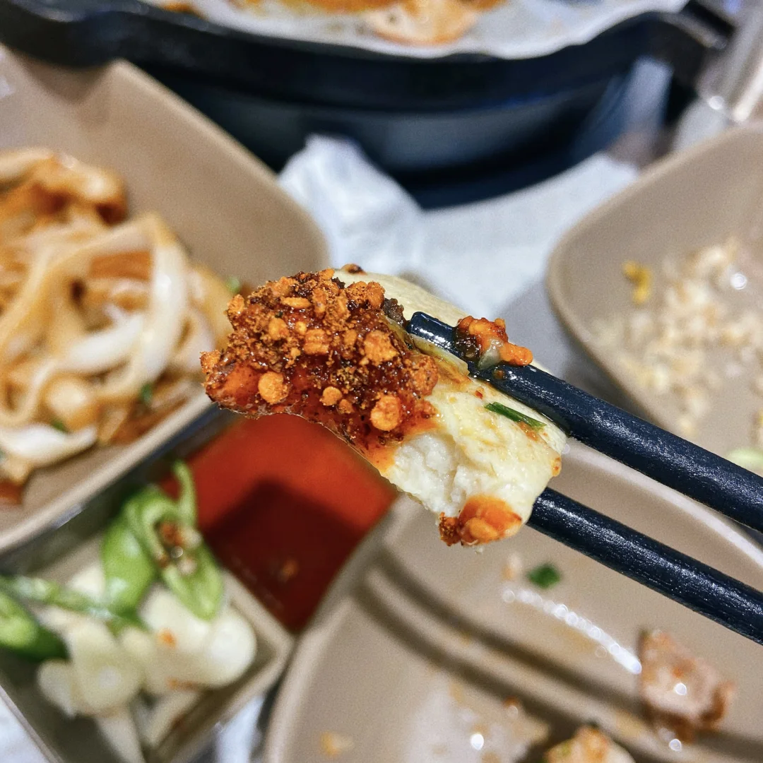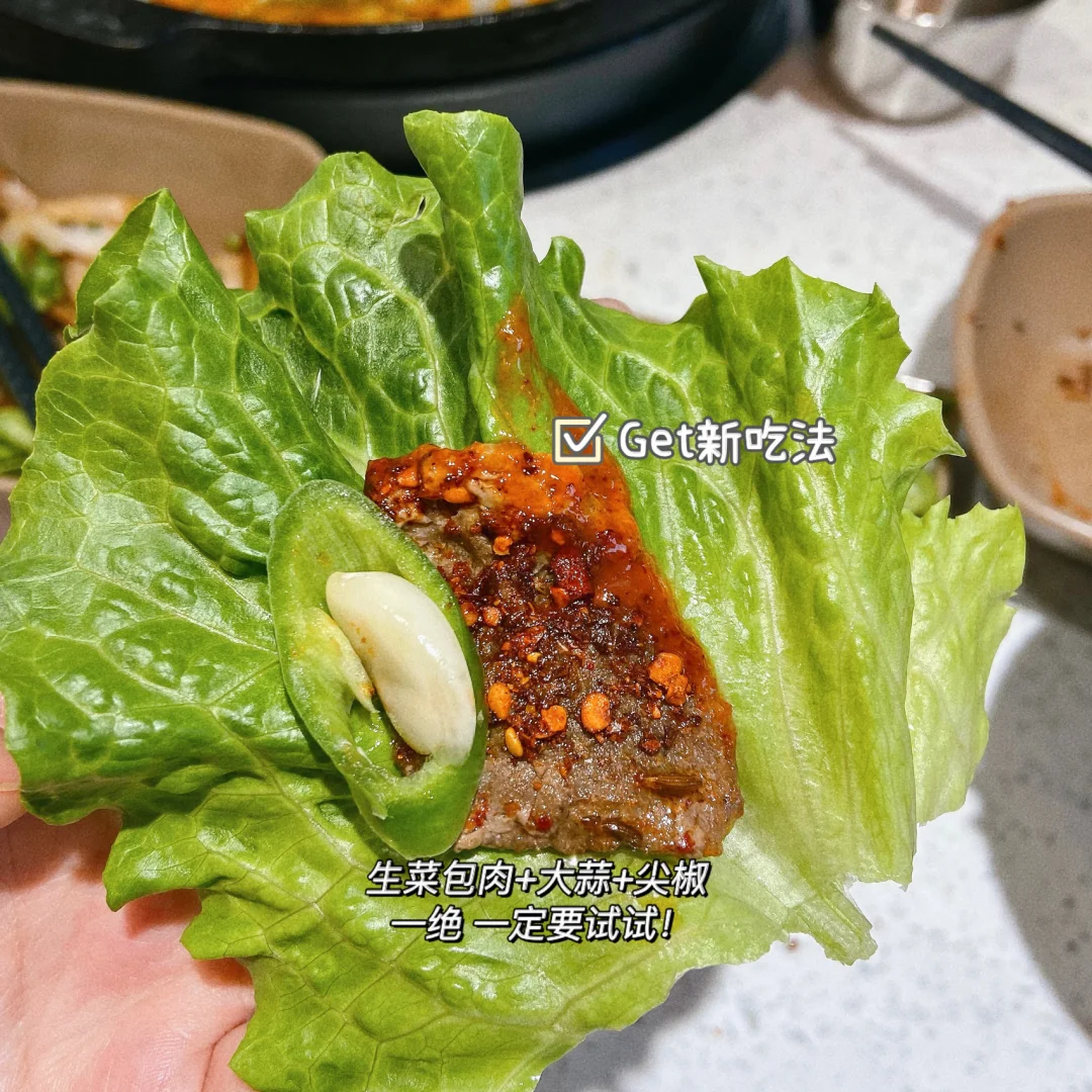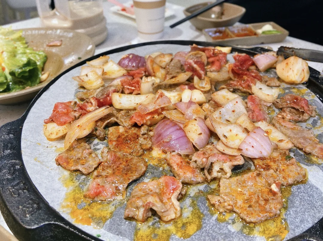 店里的招牌分量很足 烤起来油脂滋滋的冒起来 搭配生菜和大蒜 尖椒简直绝了 一级棒 不爱吃大蒜的我直接爱了[哇R]