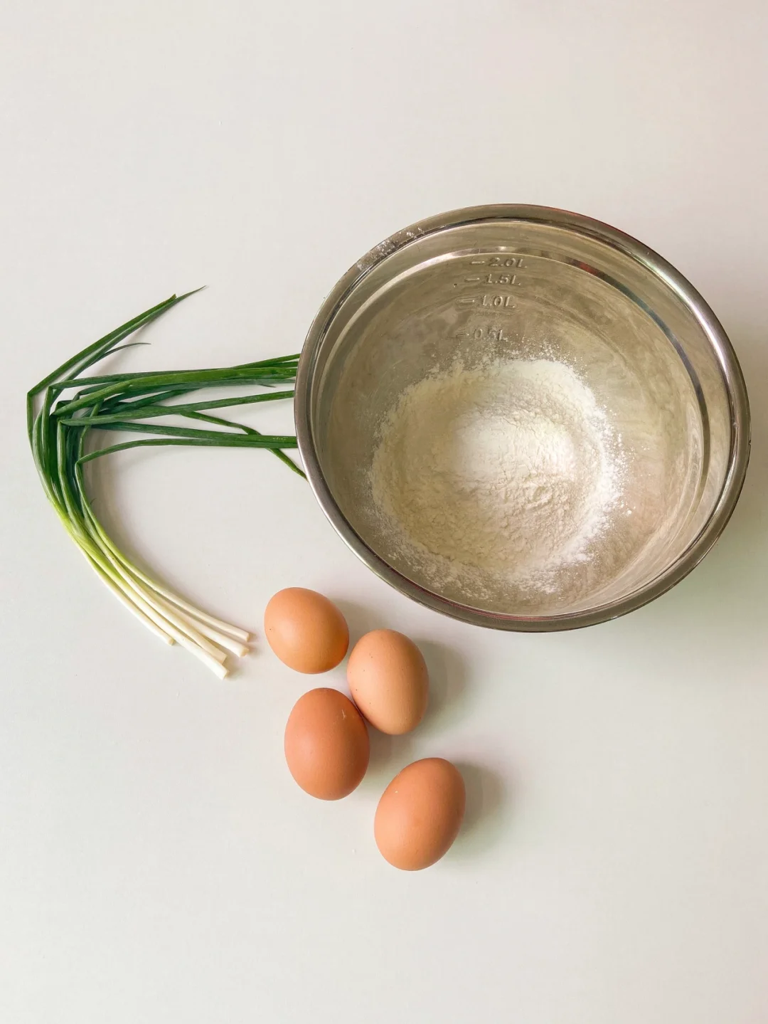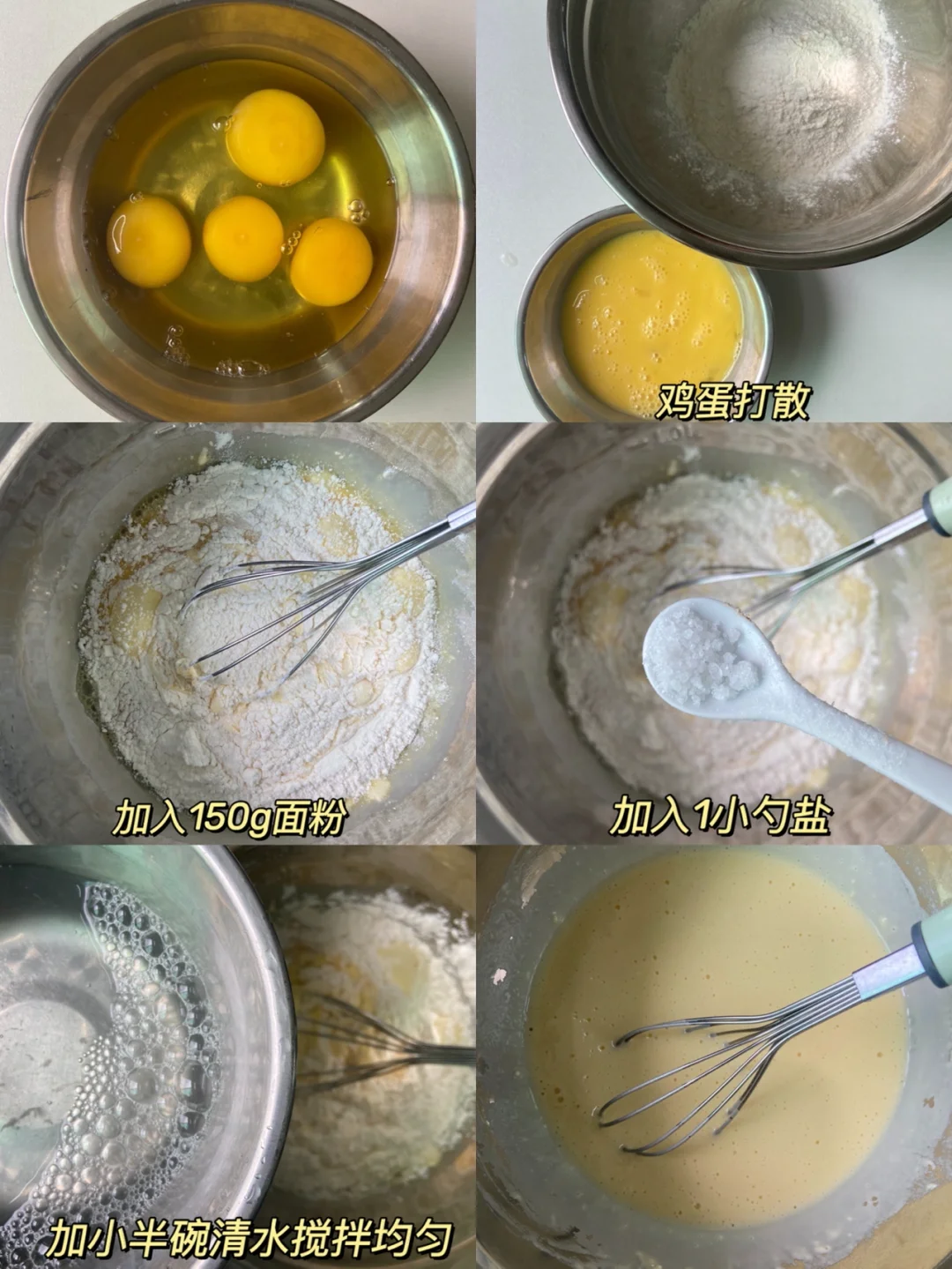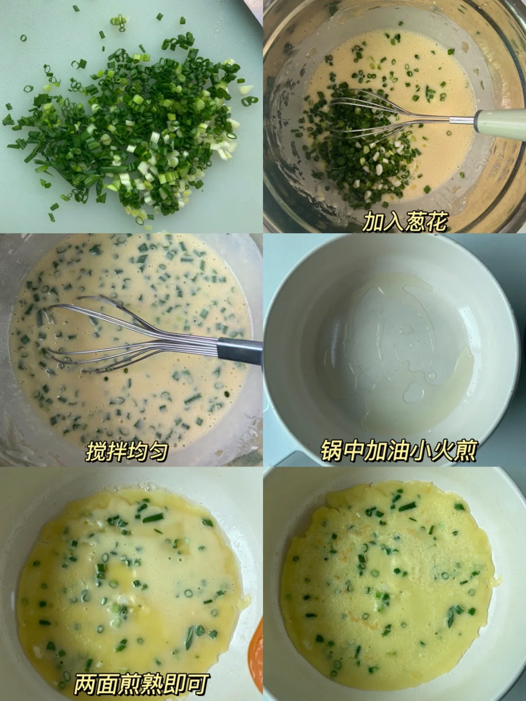 准备食材✨✨✨✨✨ 鸡蛋4颗 面粉150g 葱4根 做法✨✨✨✨✨ 1️⃣鸡蛋打散 加入150g面粉 加入1小勺盐 加小半碗清水搅拌均匀 加入葱花搅拌均匀 2️⃣锅中加油小火煎 两面煎熟即可 超级简单又好吃的鸡蛋饼 早上起来做一份陪孩子一起吃特别香!😋