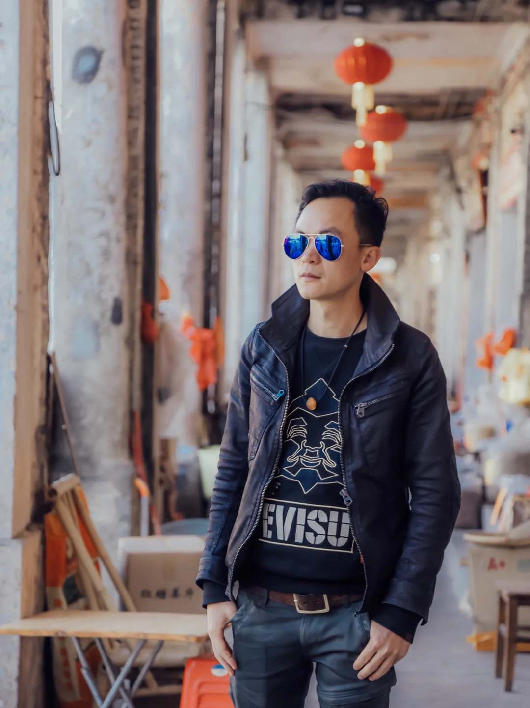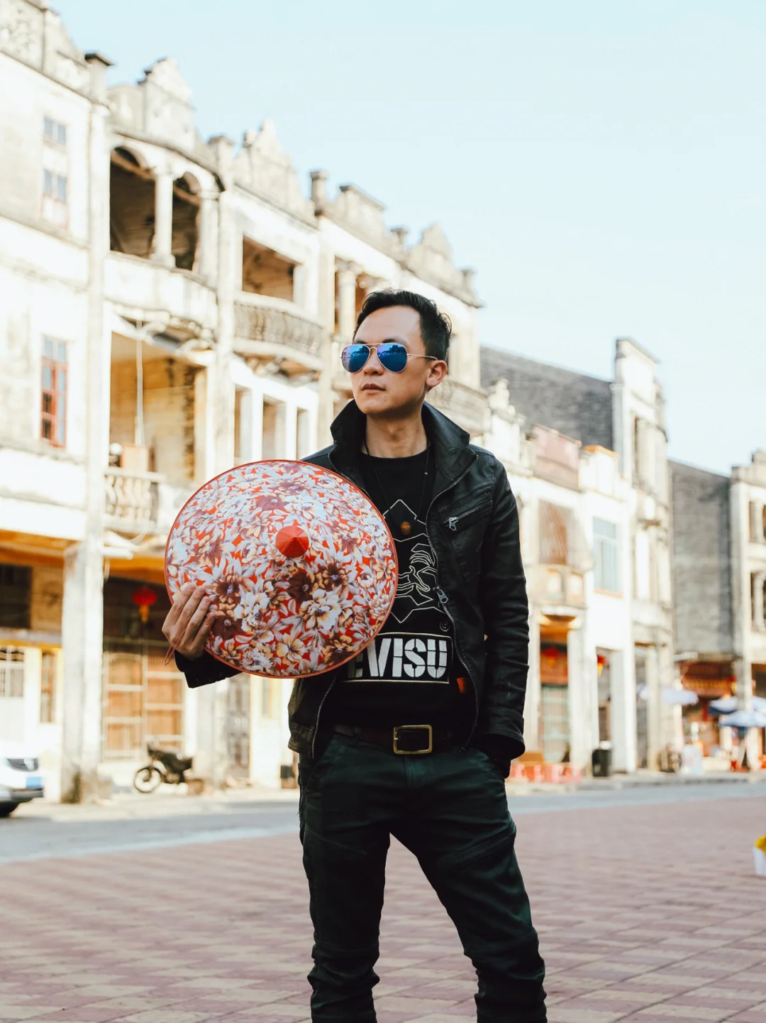 4⃣️站在一排商店面前拍摄。