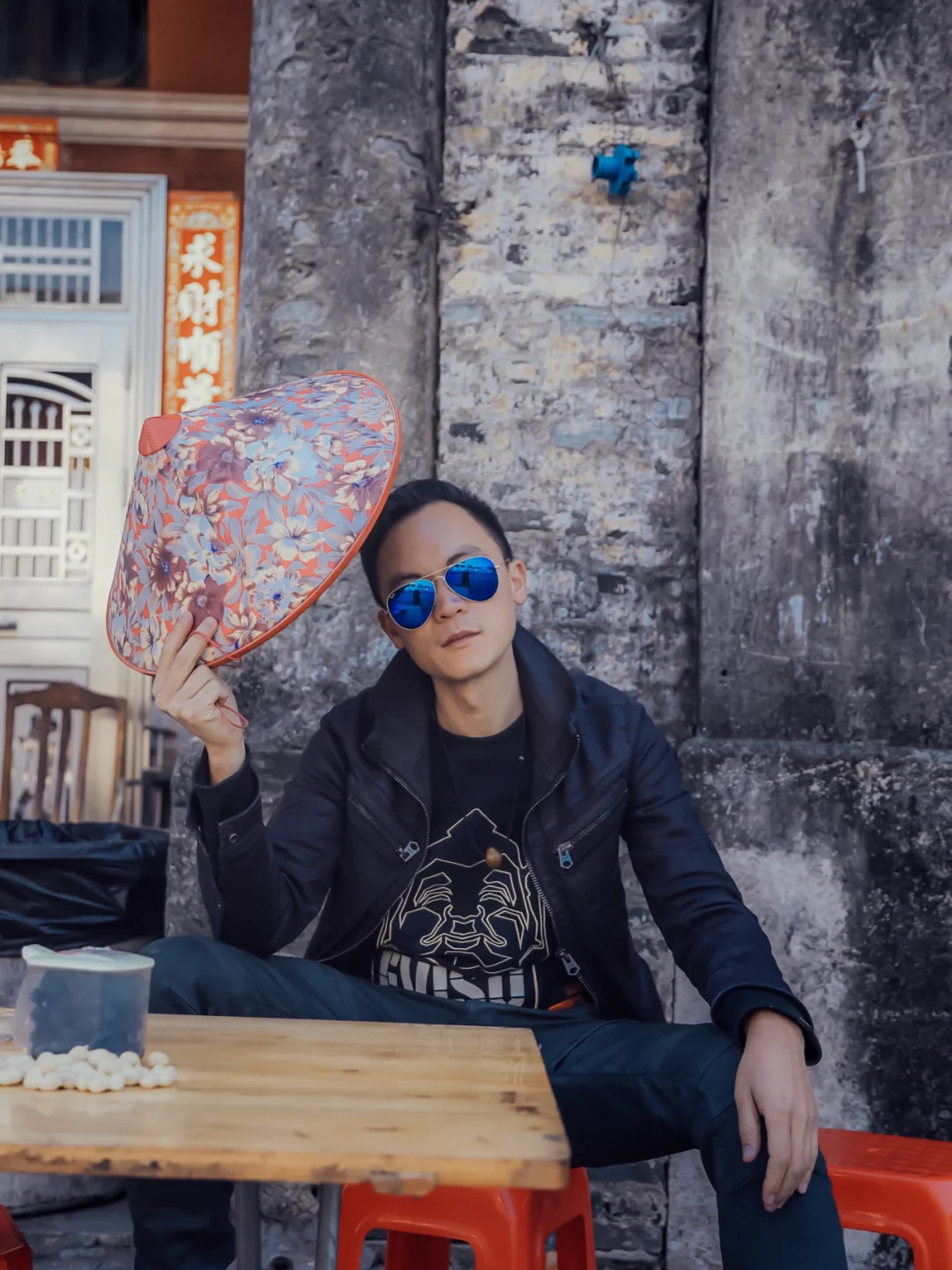 2⃣️找个桌子坐下,拿个道具拍摄。