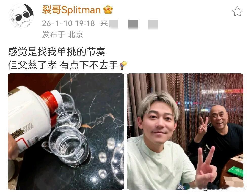 1月10日,苏醒用小号发文说:“感觉是找我单挑的节奏,但父慈子孝有点下不去手。” 醒哥发了两张图片,原来是他和老苏总两人相聚喝酒,不知道父子俩谁的酒量好。 我好像记得醒哥有痛风吧,还是少喝一点吧。 我最羡慕的就是醒哥和父母的关系,一家三人处成了朋友,有什么话都可以直说,大家觉得呢?