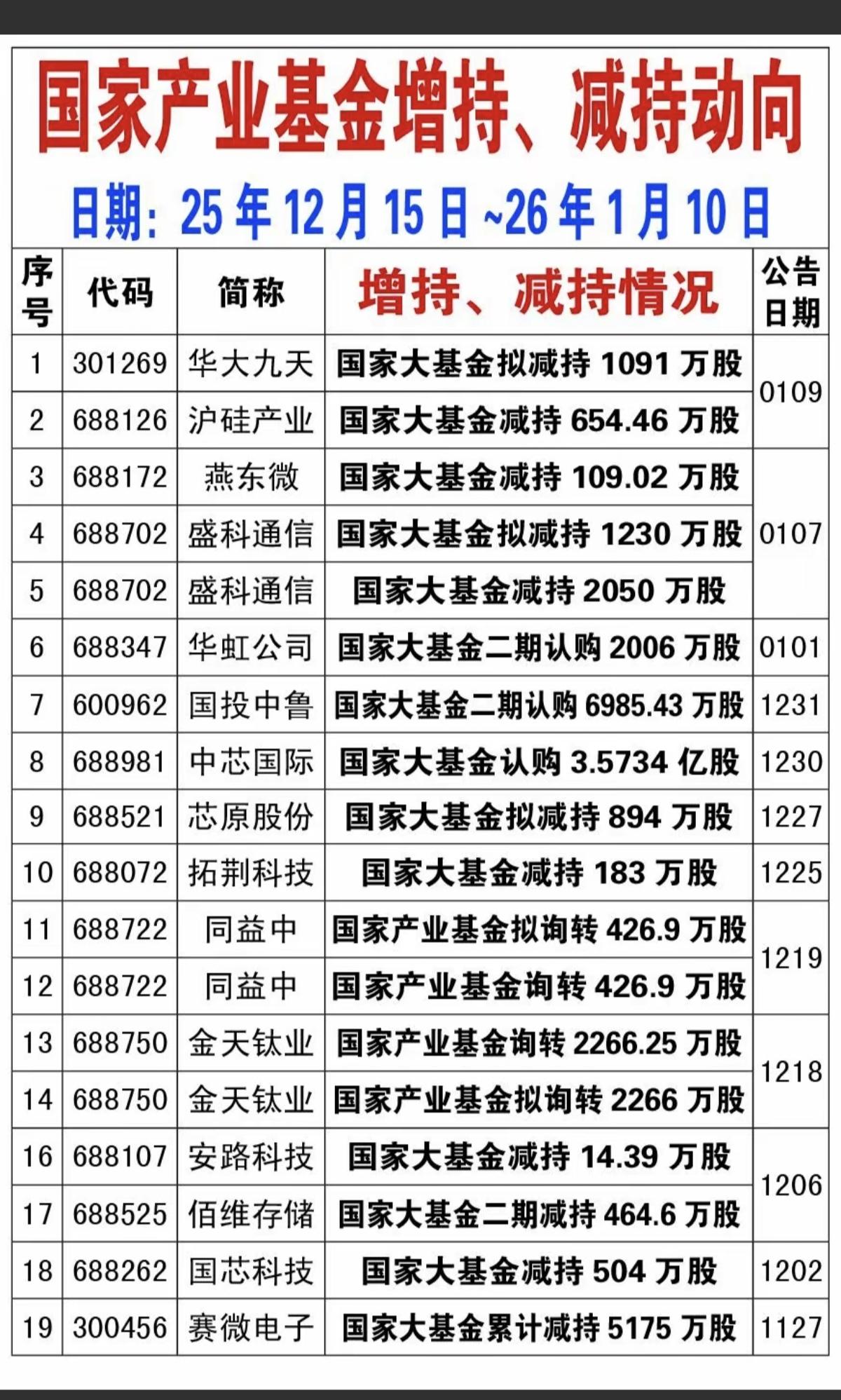 最新:国家大基金增持、减持动向! 特别是国家产业大基金近期认购的,可以重点关注一下。 国家大基金获取的信息不是一般人都知道的,包括公司潜力和未来发展预期。