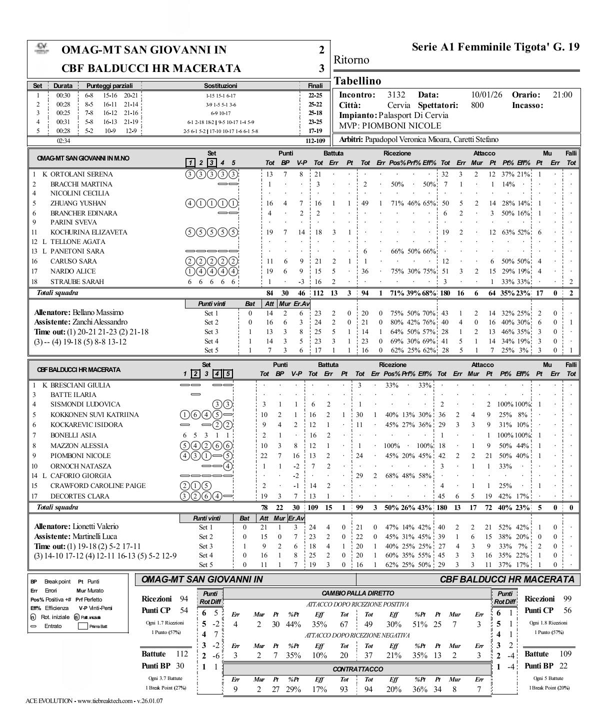 圣乔瓦尼2-3不敌马切拉塔,保级堪忧 2025-2026女排意甲联赛第十九轮,圣乔瓦尼主场2-3憾负马切拉塔遭遇四连败,比分22-25, 25-22, 25-18, 23-25, 17-19。庄宇珊50扣14中5失2被拦、1拦1发16分列本队得分榜第三,对方皮翁博尼42扣21中2失2被拦、1拦0发22分全场得分王并MVP。目前圣乔瓦尼仍积分垫底。 圣乔瓦尼: 科丘里那19扣12中2失0被拦、6拦1发19分 纳尔多45扣19中6失5被拦、0拦0发19分 庄宇珊50扣14中5失2被拦、1拦1发16分 奥托拉尼32扣12中3失2被拦、1拦0发13分 卡鲁索12扣6中0失0被拦、4拦1发11分 布兰彻6扣3中2失0被拦、1拦0发4分 斯特劳贝3扣1中0失0被拦、0拦0发1分 布拉奇7扣1中1失0被拦、0拦0发1分 马切拉塔: 皮翁博尼42扣21中2失2被拦、1拦0发22分 德科尔特斯45扣19中6失5被拦、0拦0发19分 马聪18扣9中0失1被拦、1拦0发10分 科科宁36扣9中2失4被拦、0拦1发10分 考茨卡雷维奇29扣9中3失3被拦、0拦0发9分 西斯蒙第2扣2中0失0被拦、1拦0发3分 博内利1扣1中0失0被拦、1拦0发2分 克劳福德4扣1中0失1被拦、1拦0发2分 奥勒诺赫3扣1中0失1被拦、0拦0发1分 圣乔瓦尼-马切拉塔: 进攻得分:64-72 拦网得分:17-5 发球得分:3-1 对方送分:28-31 总得分:112-109 一传到位率:71%-50% 一传完美率:39%-26% 意甲女排