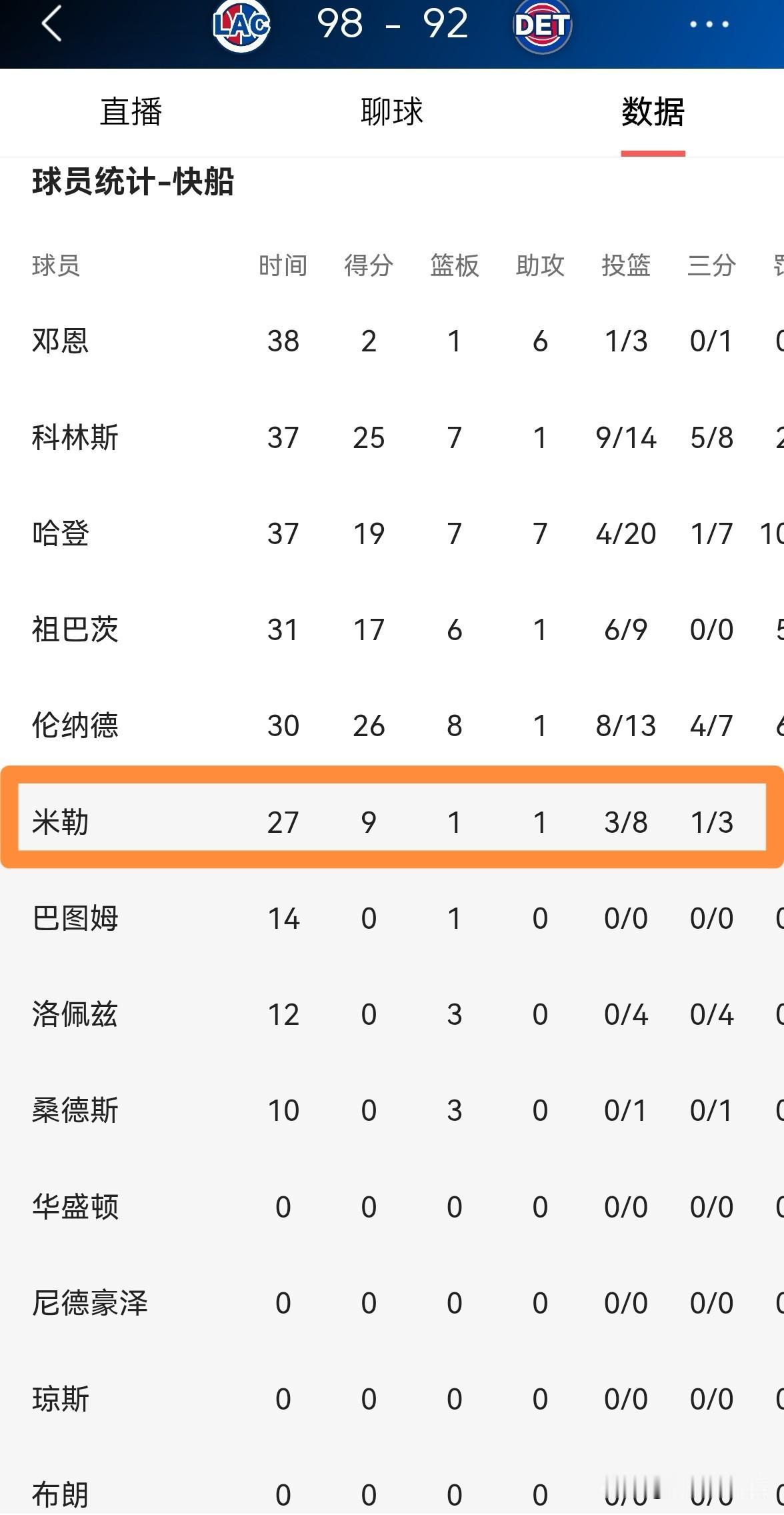 快船小将乔丹-米勒真是神鬼难测!在今天快船客场以98:92战胜活塞的比赛中,米勒和昨天打篮网时的状态相比真是天差地别。本场比赛,米勒替补出战27分钟,投篮8中3,其中三分球3中1、罚球4中2非常低效的得到9分,还有2次失误。 米勒真是神鬼难测,他的投篮稳定性真是太差了,他时而准的离谱,时而铁的离谱。