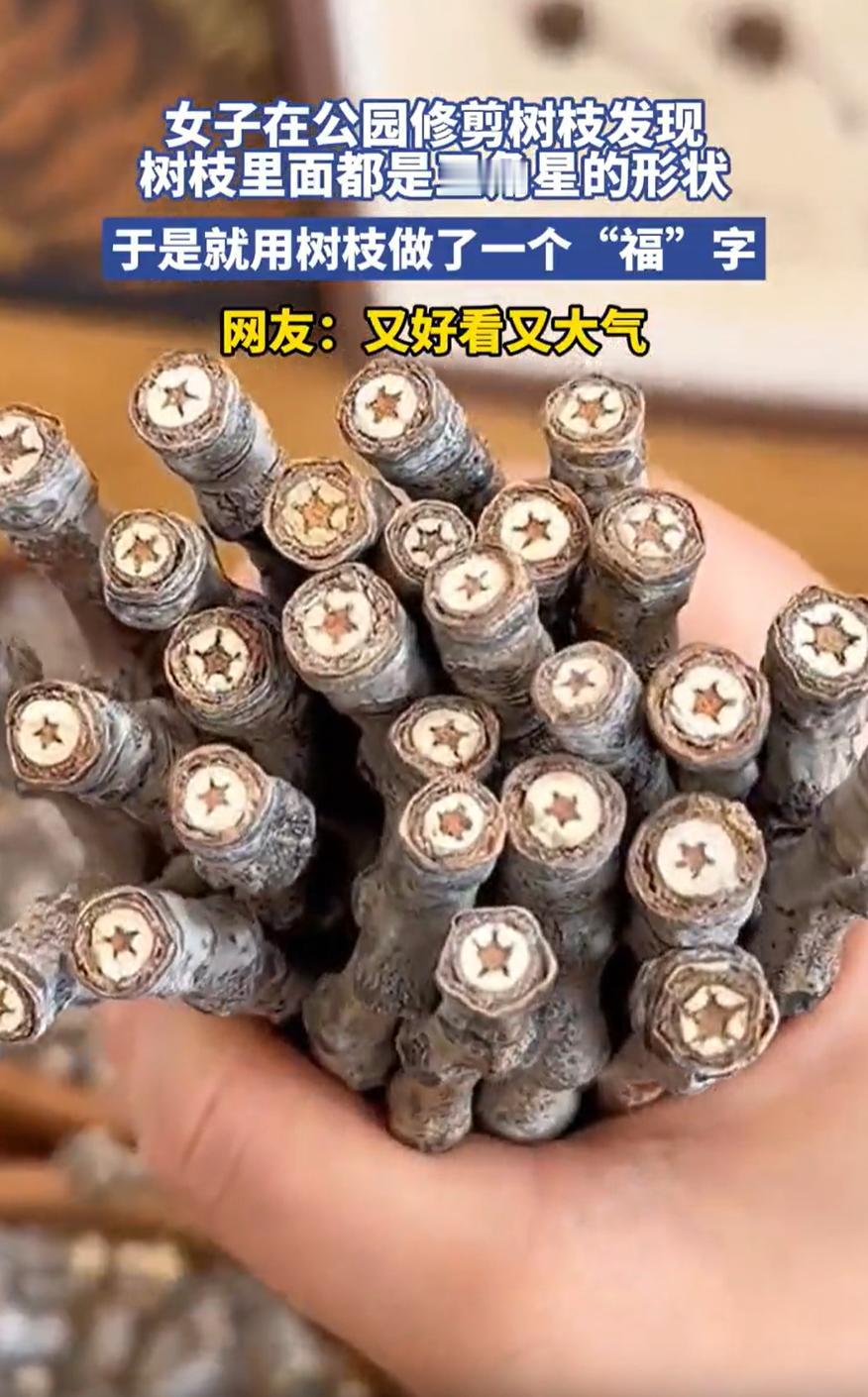 太有才了!安徽,一女子去公园修剪树枝,不过剪着剪着她就发现了一个有意思的事,那就是每根树枝里面都有一个五角星的形状,随后她就用这些五角星做了一个“福”字,网友:这能卖给我吗? 原本,女子只是去公园修剪树枝,算是一件再普通不过的事。剪着剪着,她发现不对劲,每一根被剪断的小树枝中间,居然都有一个清清楚楚的五角星。不是一两根,是几乎根根都有,整整齐齐,天然生成。要不是亲眼看到,很难相信这是树自己长出来的 她没把这些树枝随手丢掉,而是停下来琢磨了一下。先在纸上写好一个福字,再把剪好的小树枝一根根对齐、粘贴。整个过程不算复杂,也不快,前后花了一个多小时 等福字成型,远看是字,近看全是五角星,密密麻麻却一点不乱,看着特别踏实。这种东西放家里,比流水线年画更有味道 事后,不少网友都讨论起树枝的品种 有网友说:记的小时候每年清明节去烈士陵园扫墓,我们都会捡路旁的树枝,因为树枝里都有五角星。 还有网友说:这是我国本土杨树,这种杨树不飞絮,耐寒耐旱抗虫,缺点是绿的时间短。飞絮的那种是从美国引进的品种,每年绿的时间比较长,耐寒,缺点是飞絮,没有本土杨树那么抗旱 其实我觉得,这个事不在五角星有多稀奇,而在于她没有错过这个细节。很多人每天从树下走过,从来不会低头看一眼横切面长什么样,更不会想着把它变成一件作品。她做的事很简单,就是把自然已经给出的东西,稍微整理了一下,放到了一个合适的位置 这类创意之所以让人愿意看,也愿意转发,本质不是手工多高级,而是让人意识到,原来生活里还有这么多被忽略的小惊喜。不是非要花钱、非要复杂设计,很多时候,耐心和一点点观察,就已经够用了