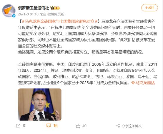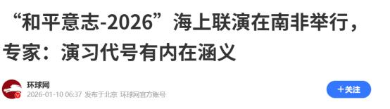 行动准时开始!2026年1月9日,国防部宣布联合演练消息!中国主导,伊朗派兵,俄也派兵,马克龙通知七国后退! 近年来美西方众多国家形成霸权,试图横霸国际,并制衡我国等一些国家。为了实现这一目的,美西方国家采取了很多实际措施。例如联合其他国家举行军事演习,对薄弱小国进行单边霸凌等。 美西方国家的这种行为在加剧国际局势,针对这种情况,我国也联合了其他国家举行海上联演。 就在2026年1月9日的时候,我国国防部重磅宣布“和平意志-2026”海上联演将在南非举行!这次的联合军事演习是由我国主导,多个国家派兵共同参与组成的一场演练。 这次军事演习备受国际关注,尤其是美西方国家。这些国家将这次的军事演习,视为对其自身霸权的一种示威。但同时美西方国家也担心金砖军事会有所增强,同美西方国家有制衡的能力。 所以美西方国家高度关注此次军事演习,作为法国总统的马克龙更是第一时间发出了警告。马克龙向法国驻外大使发表的年度讲话中明确表示,首要任务是尽一切可能避免全球分裂,避免让七国集团成为反华俱乐部。 随着中国的军事实力得到发展,中国在国际的话语权也有所增加。越来越多的国家选择向中国靠拢,而中国在对待盟友方面则是满怀善意诚意。现如今中国的盟友实力越来越强,也让不少的国际组织为之恐惧。 对此,您怎么看?欢迎评论区留言您的看法,我们一起讨论一下。 (信息来源:“和平意志-2026”海上联演在南非举行,专家:演习代号有内在涵义-环球网) (信息来源:俄罗斯卫星通讯社-20260109-微博)