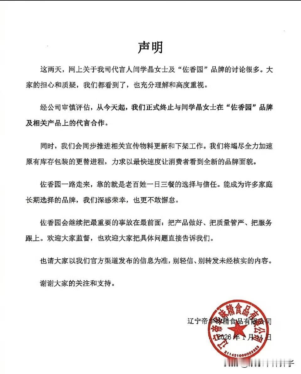 闫学晶老师真是“雪上加霜”,不仅丢了代言,儿子又被实名举报! 这几天,闫学晶因为直播“哭穷”引发争议,一番肺腑之言,可以说,刺痛很多网友的心,多次登上热搜。 估计闫学晶老师自己也没想到,会惹出这么大的麻烦,不仅账号被禁止关注,还有博主晒出视频实名举报,质疑其儿子“新疆班”入学资格的合规性,表示目前还在等待官方的调查结果。 1月11日,佐香园发布声明,决定终止与闫学晶的代言合作,这……,真的是“雪上加霜”呀! 话说,作为艺人,本就应该谨言慎行,有些话,关上门跟家人随便唠,结果不拿网友当外人,这就是所谓的“祸从口出”吧! 这下可好,形象受损,代言没了,还波及到了儿子,得不偿失。