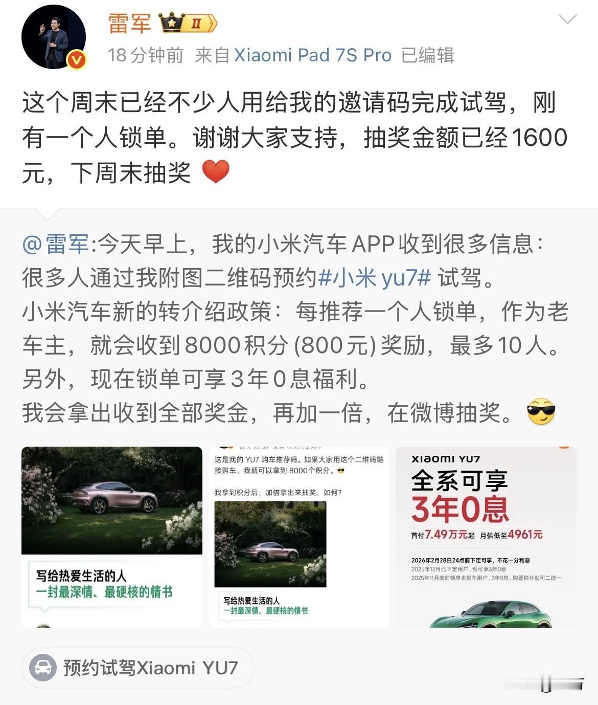 雷军:抽奖金额已经1600元! 就在刚才,雷军的邀请码终于起作用了! 记得他是在昨天发出来的,没想到今天就有用户,根据这个邀请码去试驾,并且在今天买车了,这样他就能够获得相应的积分! 当然,作为亿万富豪的他,会把这些积分用双倍的形式抽奖,送给关注他的粉丝们! 所以目前,他这个奖金已经累积到了¥1600,因此今天晚上他在社交网络上,晒出了自己一天的成绩,并且表示很开心,自己开单了! 看来他多多少少对自己的影响力还是有点满意的,毕竟真的有用户根据他这个推荐去买了车,只是不知道这种模式会不会形成一种气候,但是最好不要布置任务,不然员工们都去找邀请码了[看] 但不管怎么样,这个事情对于普通用户来说,,尤其是对小米的老车主来说,是能够得到实实在在的回报的,毕竟只要有人通过你的邀请码成功锁单了,你就可以获得相应的奖金。 你觉得雷军的这一招怎么样?