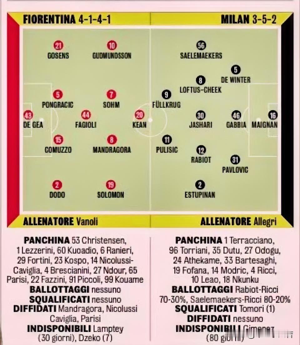 米兰与佛罗伦萨之战首发阵容预测。据说阿莱格里还没有正式决定首发阵容,比安钦与斯基