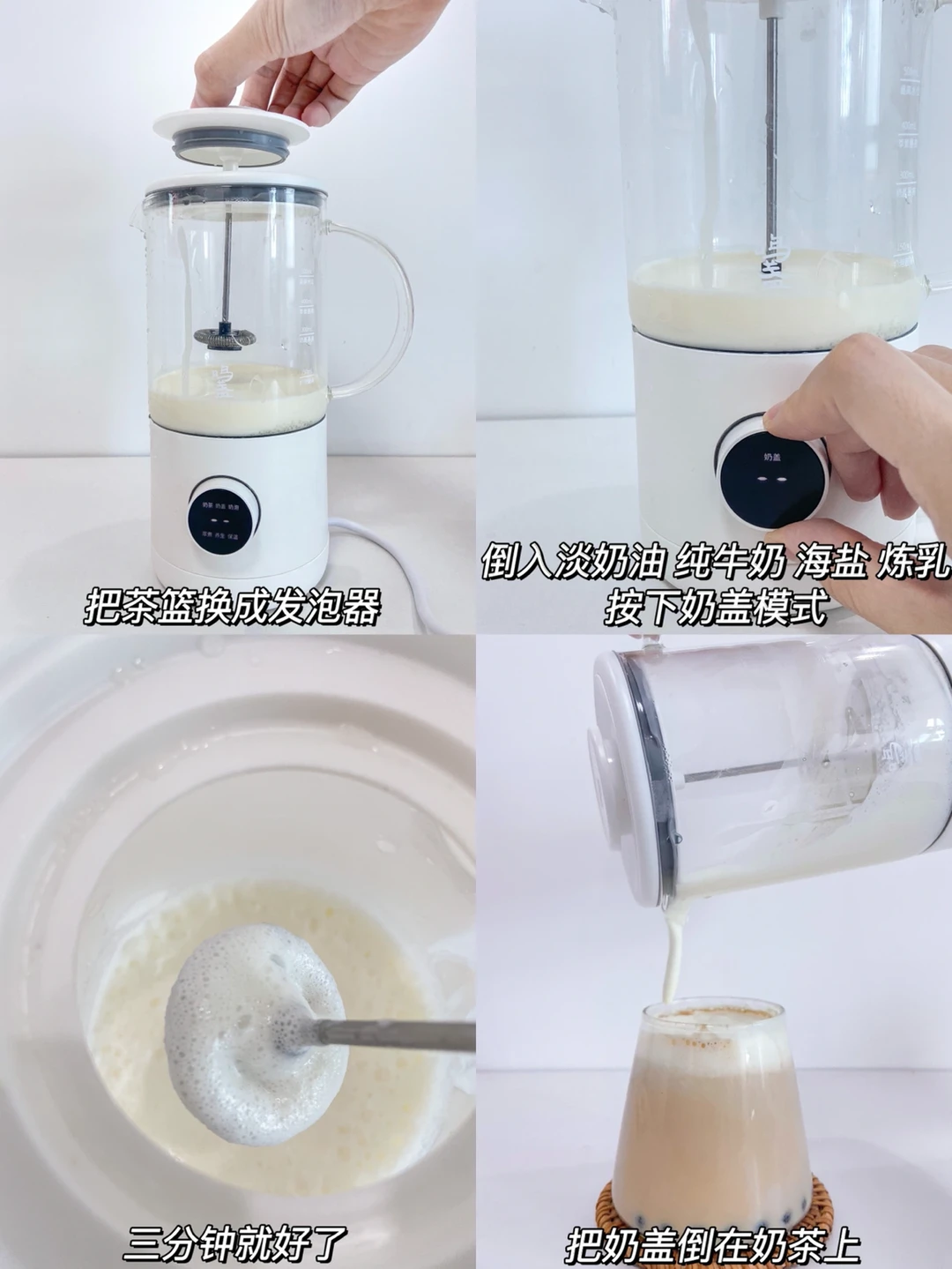 4️⃣换成发泡器 倒入淡奶油 纯牛奶 海盐和炼乳按下奶盖模式 3分钟就好了